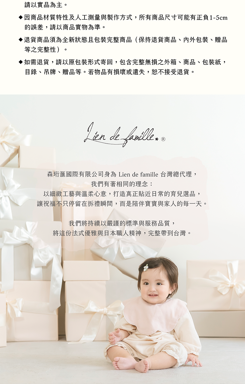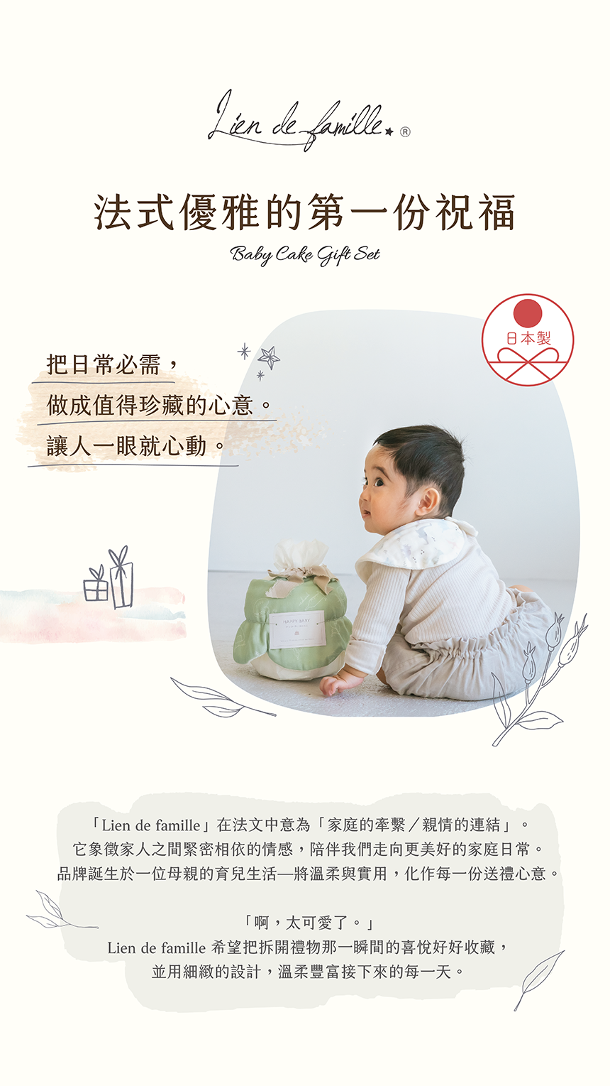 ✦商品介紹Lien de famille 尿布蛋糕採用自然柔和的色彩設計,內含一組日本製造的多功能拍嗝巾兩用圍兜和尿布。
