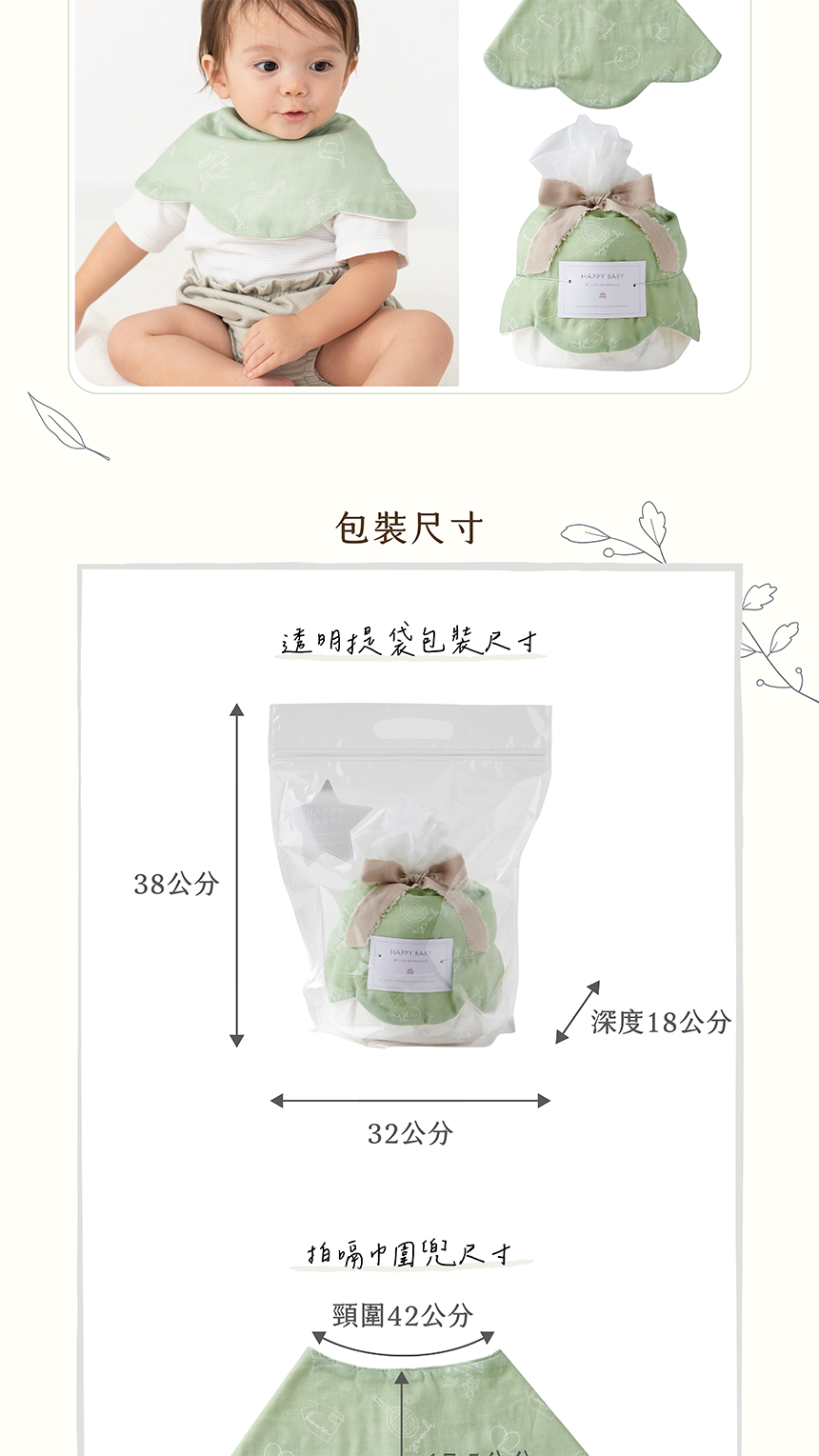 禮盒形式:透明提袋,尺寸:寬32x高38x深18公分圍兜:約寬33 x 高17.5公分,頸圍:42公分,展開寬度:48公分尿布:黏貼式,S碼(約4-8公斤)