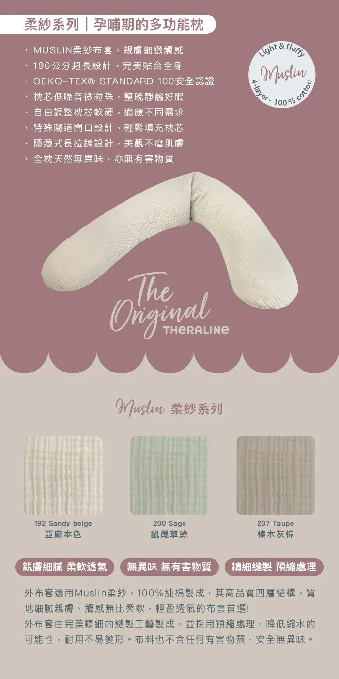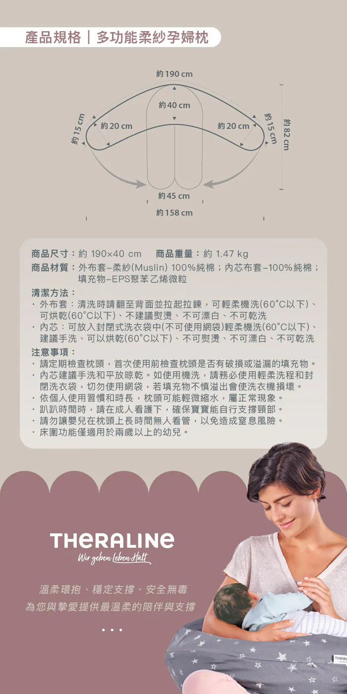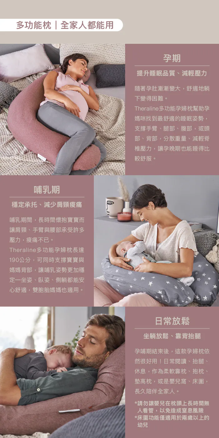 孕婦枕商品摘要:德國 Theraline 暢銷歐洲多年,30 年專業製枕經驗。安全無毒材質、溫柔環抱設計,提供穩定又安心的支撐,是歐洲家庭長年信賴的高品質枕頭品牌。