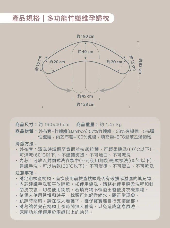 孕婦枕商品特色:· 德國製造,全家人都能用的多功能枕· BAMBOO竹纖維布套,親膚滑順涼爽· MUSLIN柔紗布套,親膚細緻觸感· 190公分超長設計,完美貼合全身· OEKO-TEX® STANDARD 100安全認證· 枕芯低噪音微粒珠,整晚靜謐好眠· 自由調整枕芯軟硬,適應不同需求· 特殊隧道開口設計,輕鬆填充枕芯· 隱藏式長拉鍊設計,美觀不磨肌膚· 全枕天然無異味,亦無有害物質
