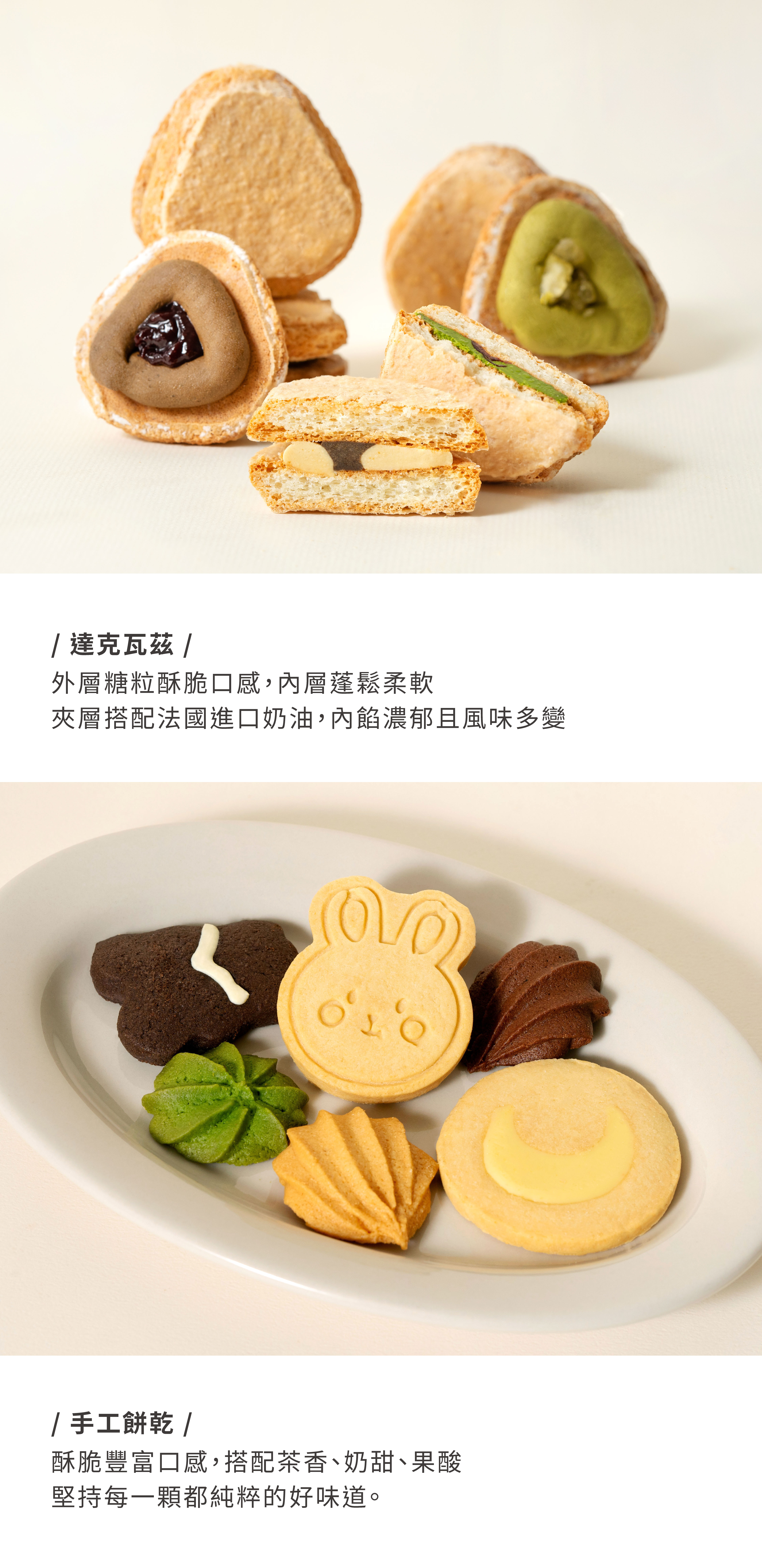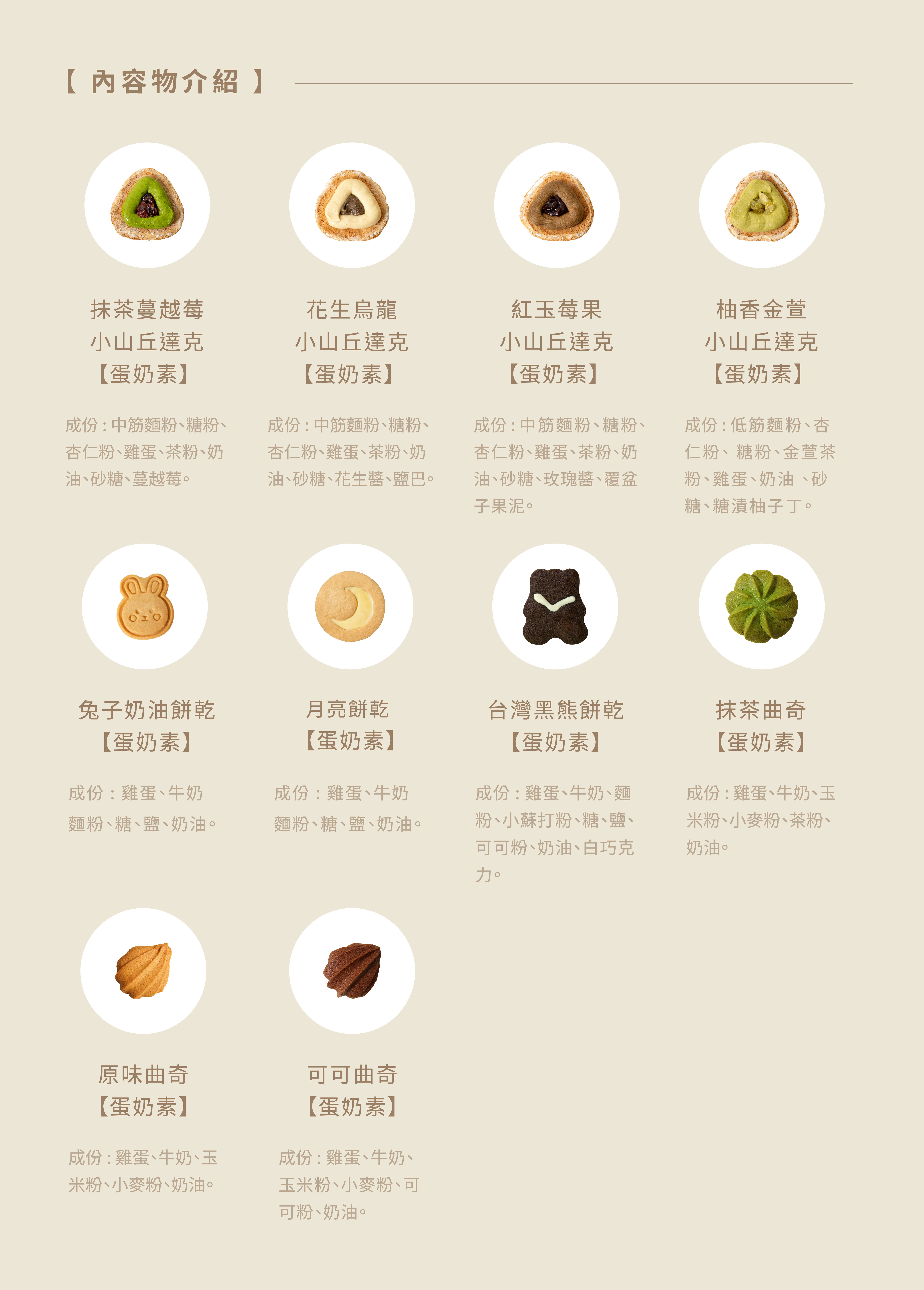 商品組合內容──────────────────抹茶蔓越莓小山丘達克 一份紅玉莓果小山丘達克 一份花生烏龍小山丘達克 一份柚香金萱小山丘達克 一份兔子奶油餅乾 2份黑熊餅乾 2份月亮餅乾 2份原味貓舌餅乾 2份可可貓舌餅乾 2份抹茶曲奇餅乾 2份保存方式:⚠餅乾未開封常溫14天;開封建議3-5天食用完畢⚠達克瓦茲商品為延長保鮮將會以冷凍寄出,到貨後可自行做常溫或冷凍保存。保存方式:常溫5天 / 冷凍7天