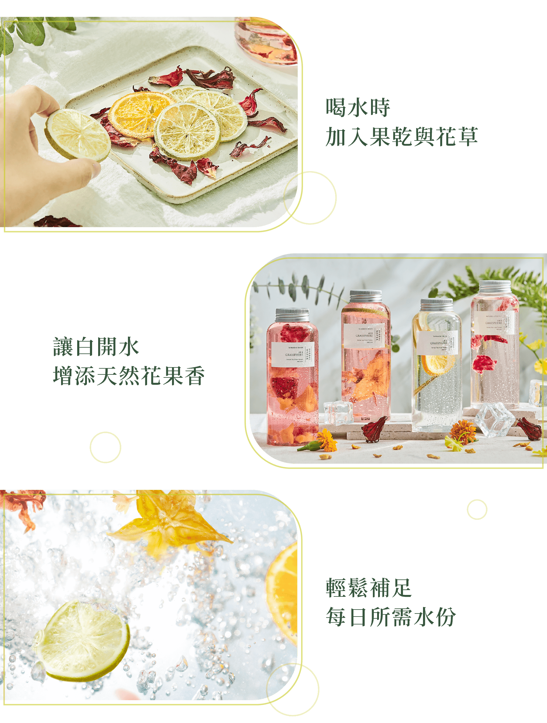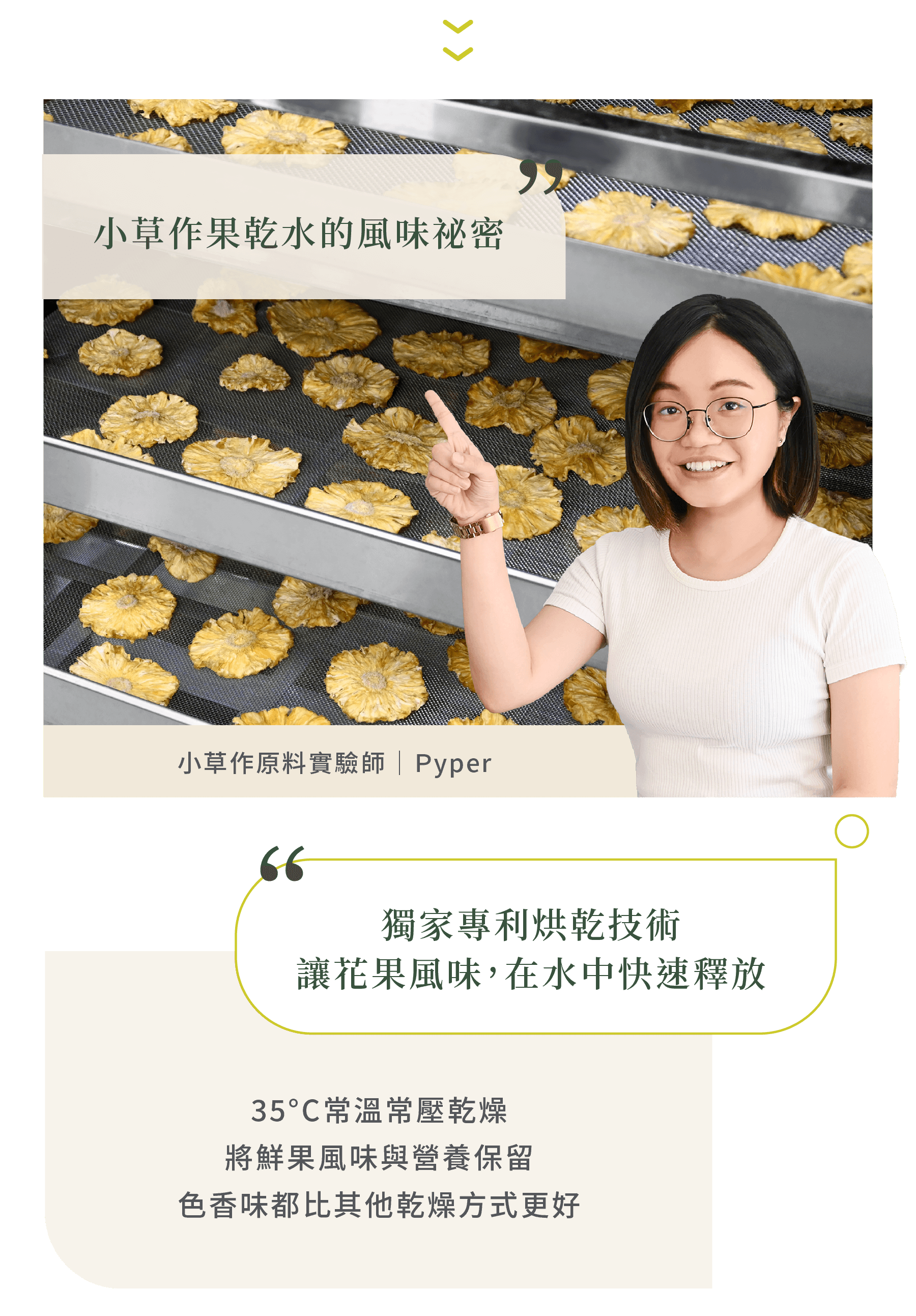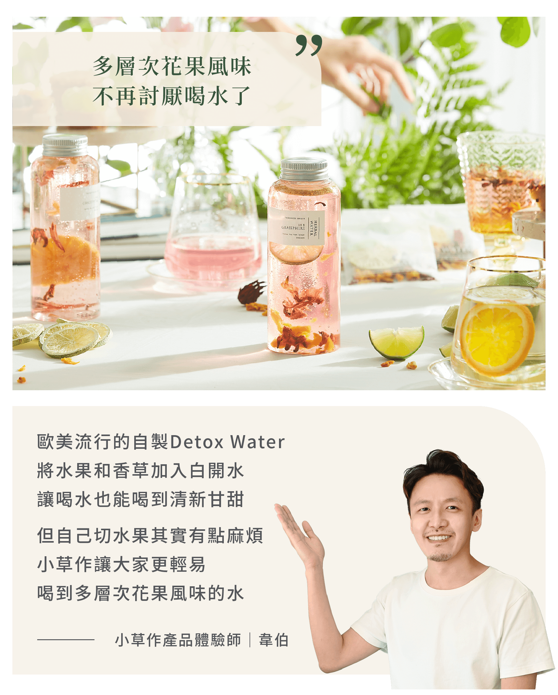 小草作台灣果乾水,補水小幫手,讓水變好喝✓ 100% 台灣水果花草,專利常溫烘乾,封存鮮果營養✓ 天然果味和清爽花草香氣,不知不覺愛上喝水✓ 無咖啡因、無添加糖、無化學添加、無人工香料