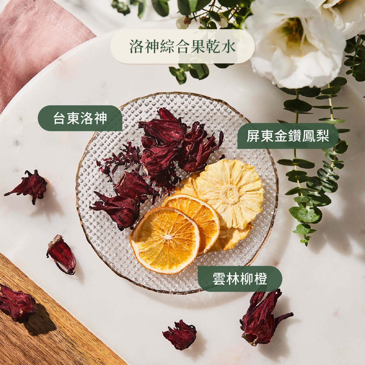 【產品規格資訊】內容物:台東洛神、屏東金鑽鳳梨、雲林柳橙保存期限:6個月保存方式:請置於陰涼處,並於開封後盡快飲用