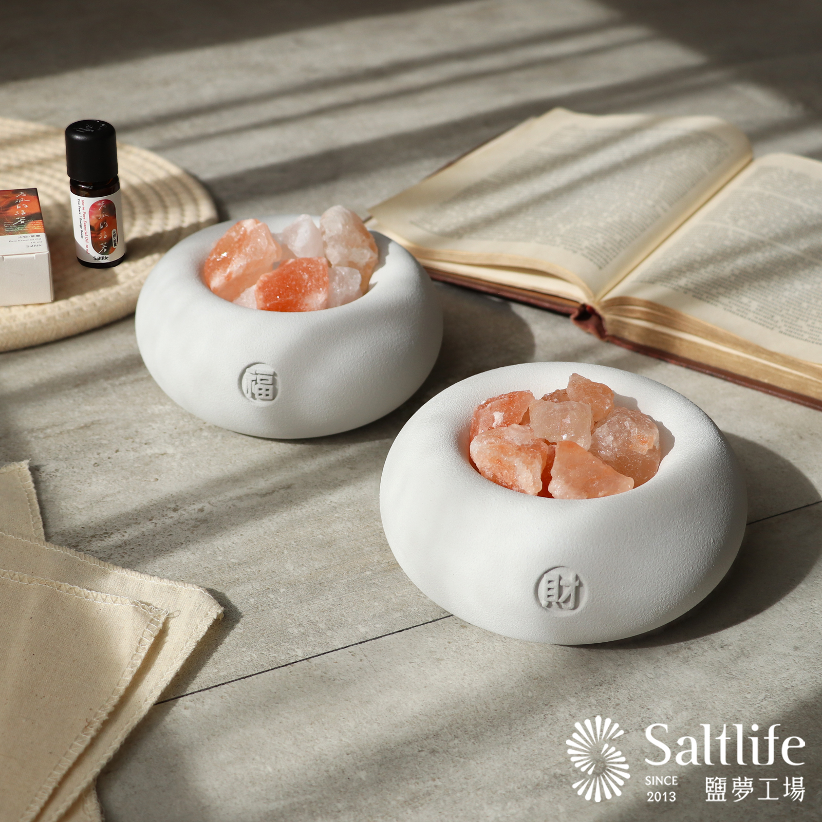 ▼ 天然鹽晶擴香盆 × 招財御守有錢花|精油兩入 新春限定組