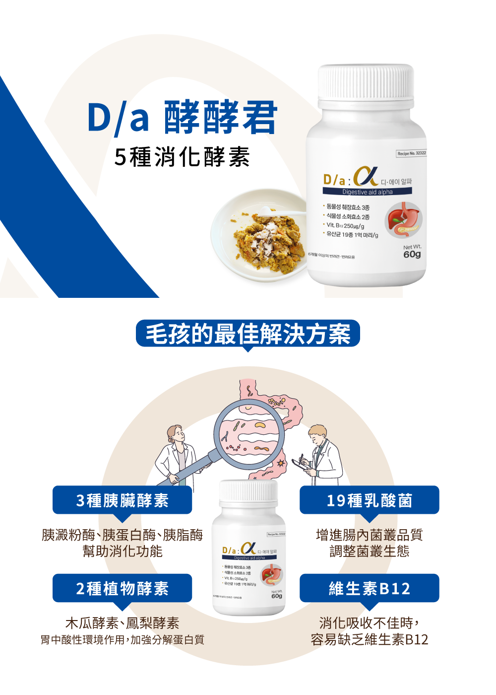 3種胰臟酵素 + 2種植物酵素 : 幫助分解食物&排便19種乳酸菌:維持腸道益菌比例,維持菌叢平衡維生素B12:消化吸收不佳時,補充容易缺乏的B12,幫助維持活力【全方位守護毛孩腸胃,適合消化吸收不良、營養補給、腸道菌叢失衡的犬貓】* 台灣食品安全檢測重金屬合格* 超過3000家韓國獸醫院指定使用