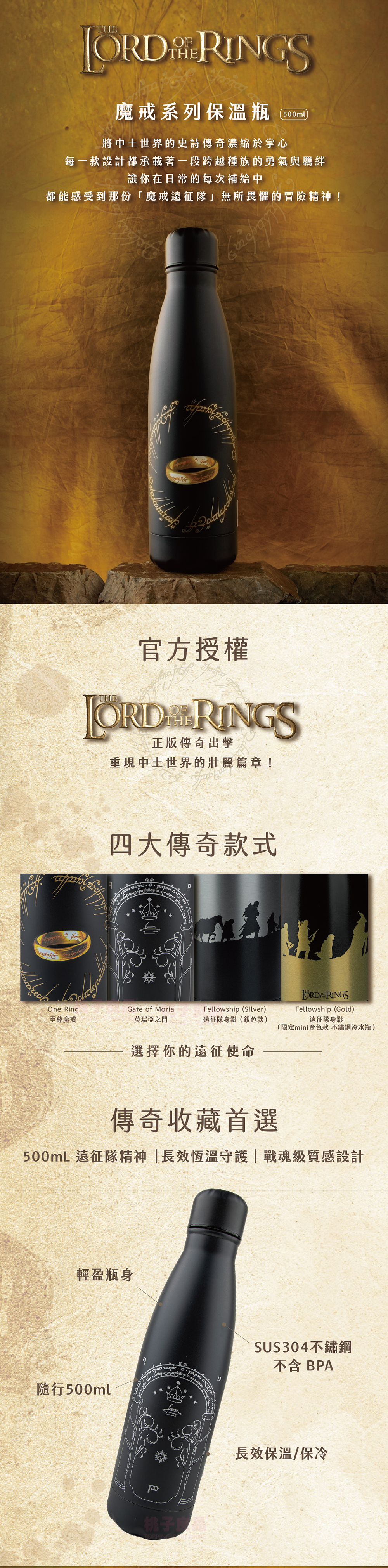 ◆ 官方授權|限量收藏級質感,法國設計工藝,Cinereplicas(電影共和國)出品!◆ 長效守護|補給溫度穩穩鎖住,不管寒風凜冽或烈焰逼近都不退場!◆ 頂級工藝材質| SUS304不鏽鋼、不含BPA,征服日常的各種挑戰!◆ 戰魂級設計| 精緻圖騰工藝,打造低調卻強悍的遠征配備!◆ 經典符碼再現| 從莫瑞亞之門到至尊魔戒,四大傳奇語彙一次集結!