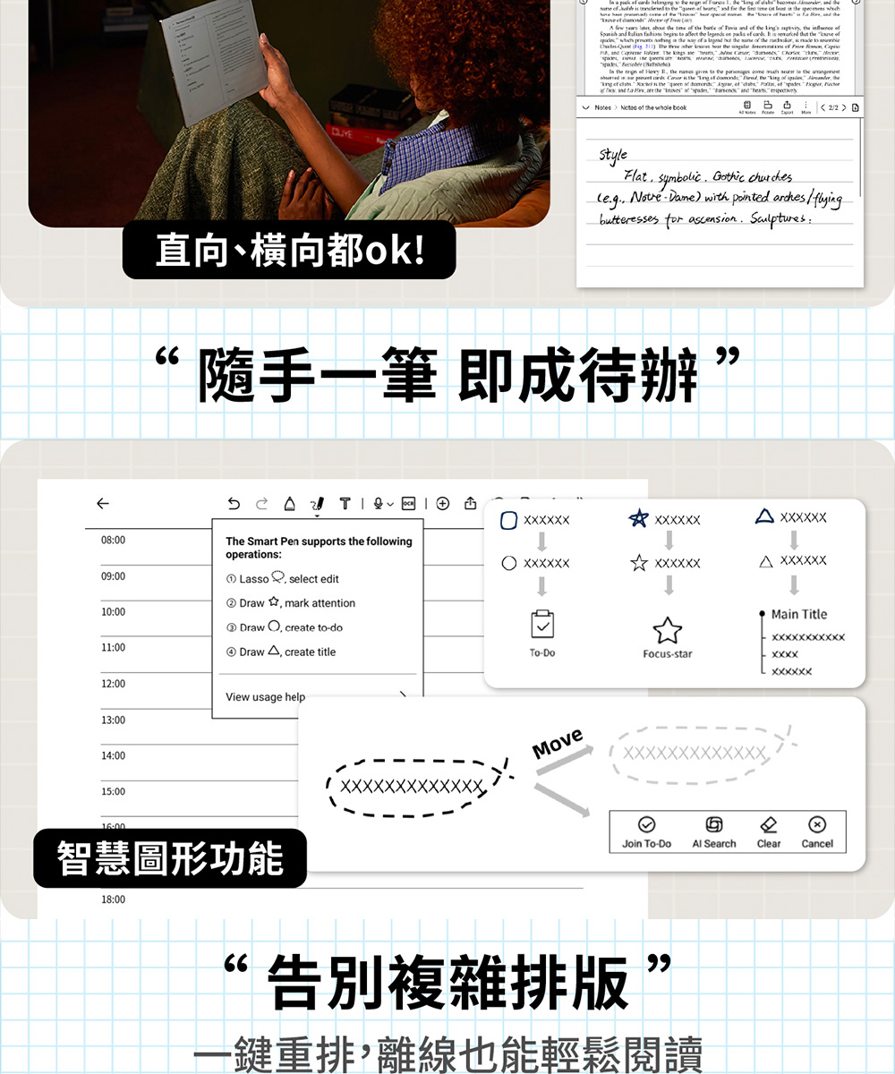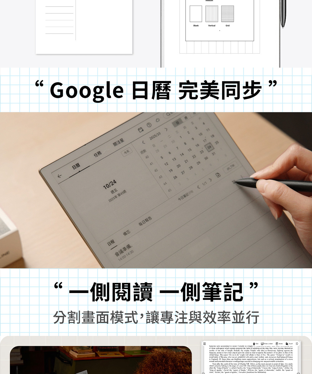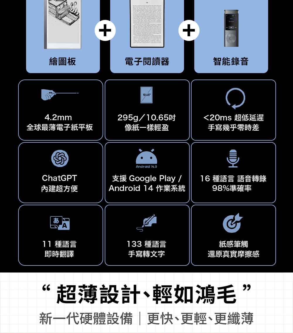 ◆輕薄 X 護眼 X 智能 X 流暢1.全球最薄電子紙平板:厚度僅 4.2 mm。2.重量輕量化:僅 295 g,隨身攜帶負擔低。3.具10.65 吋高解析 E-Ink護眼螢幕(1920×2560,300 PPI)。4.螢幕採用柔性電子紙材質,不反光、不刺激眼睛,適合長時間閱讀。5.流暢翻頁、順滑手寫與快速響應。6.支援分割畫面操作,一邊閱讀一邊記錄。