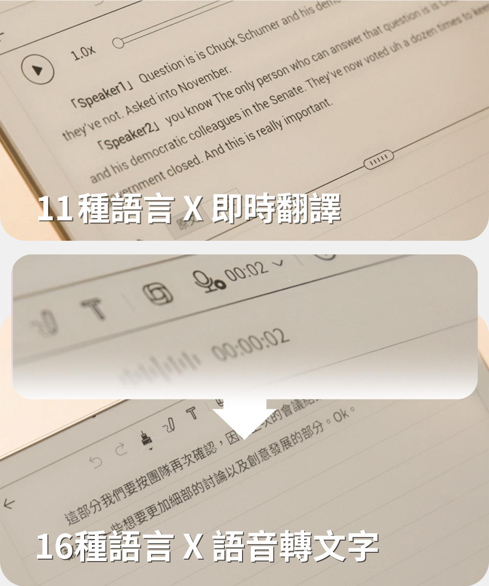 ◆多語即時轉錄與翻譯,跨國溝通不再卡關1.支援 16 種語言精準語音捕捉與轉錄。2.提供 11 國語言即時翻譯功能(跨語言溝通更便利)。3.單機即可完成語音識別、翻譯與整理重點。