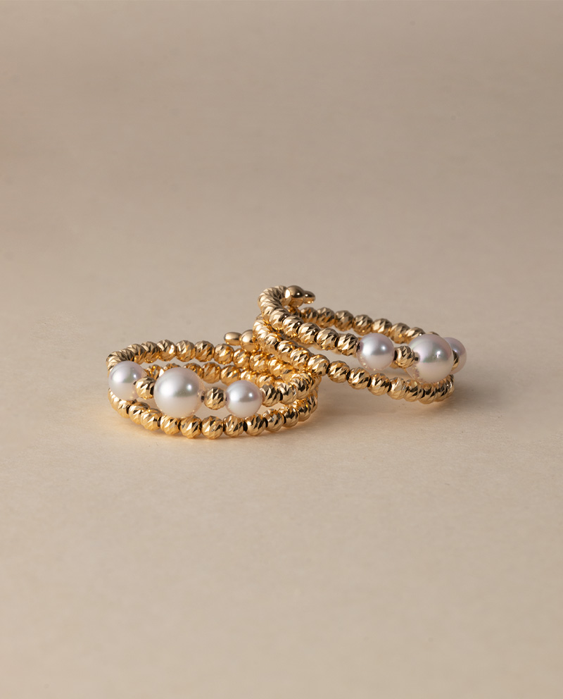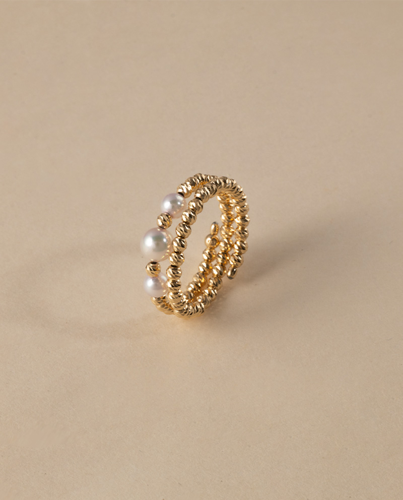 由K18黃金鑽切珠串連而成,表面多角切割能在光線下反射出細緻的閃耀效果,如同舞池中旋轉的光點,呼應「圓舞曲」的靈感來源/選用日本Akoya珍珠,以圓潤度高、光澤細膩聞名,珍珠表面幾乎無瑕,展現出如鏡面般的反射效果/戒圈採用彈性線材串製,可適應不同手指尺寸,配戴舒適且方便取下/珍珠尺寸為3 / 4mm