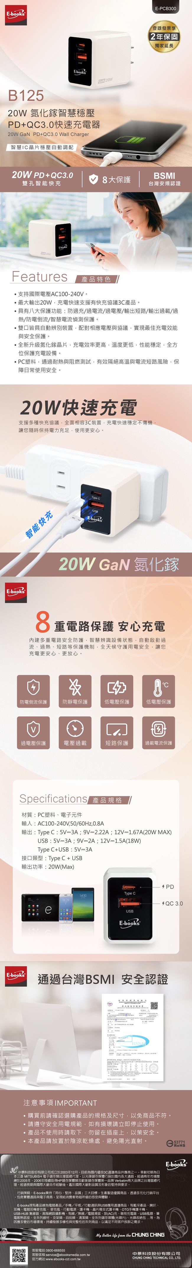 E-books B125 20W 氮化鎵智慧穩壓PD+QC3.0快速充電器