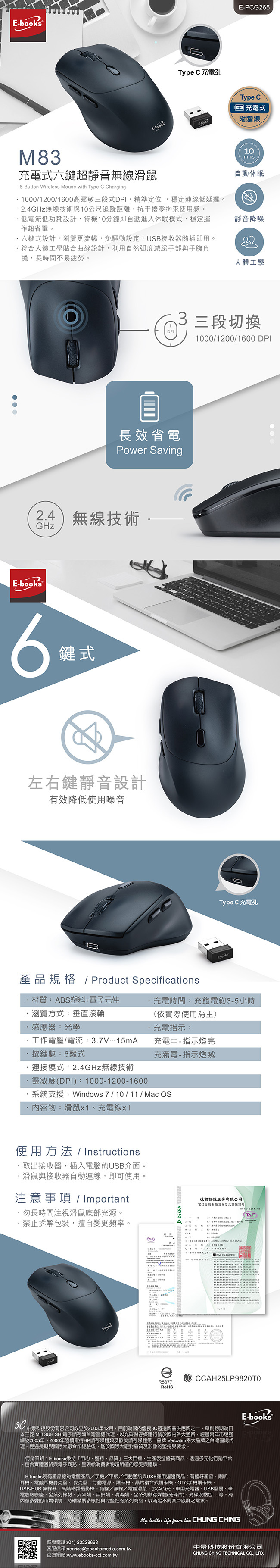 E-books M83 充電式六鍵超靜音無線滑鼠