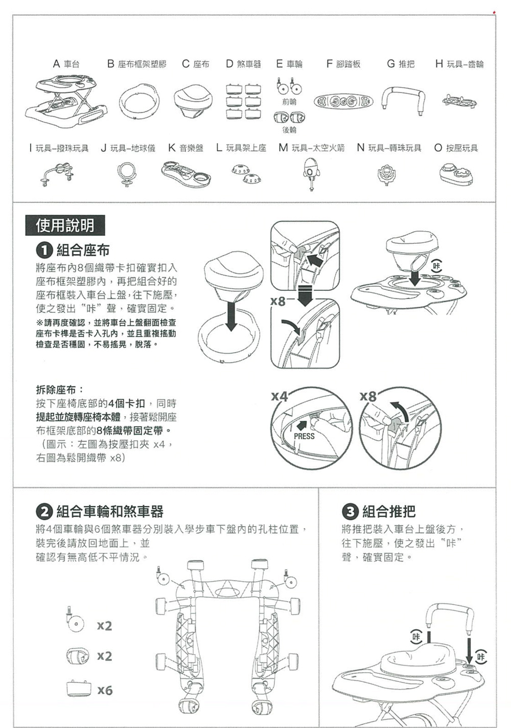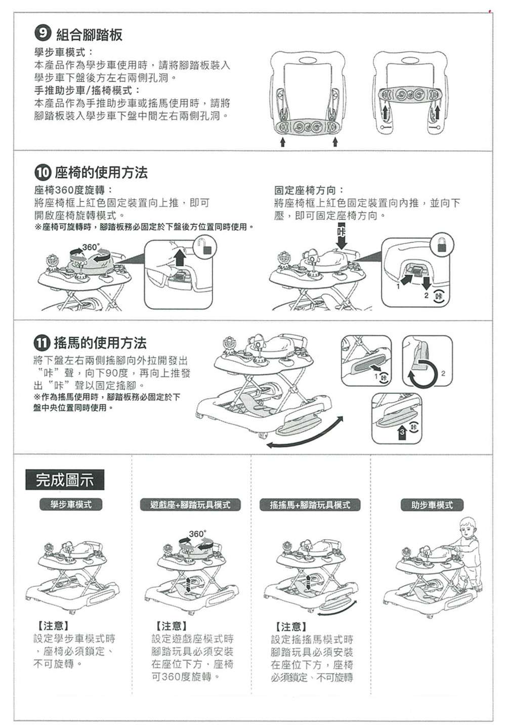 五合一特色:學步車、助步車、搖搖馬、腳踏玩具、遊戲座。
