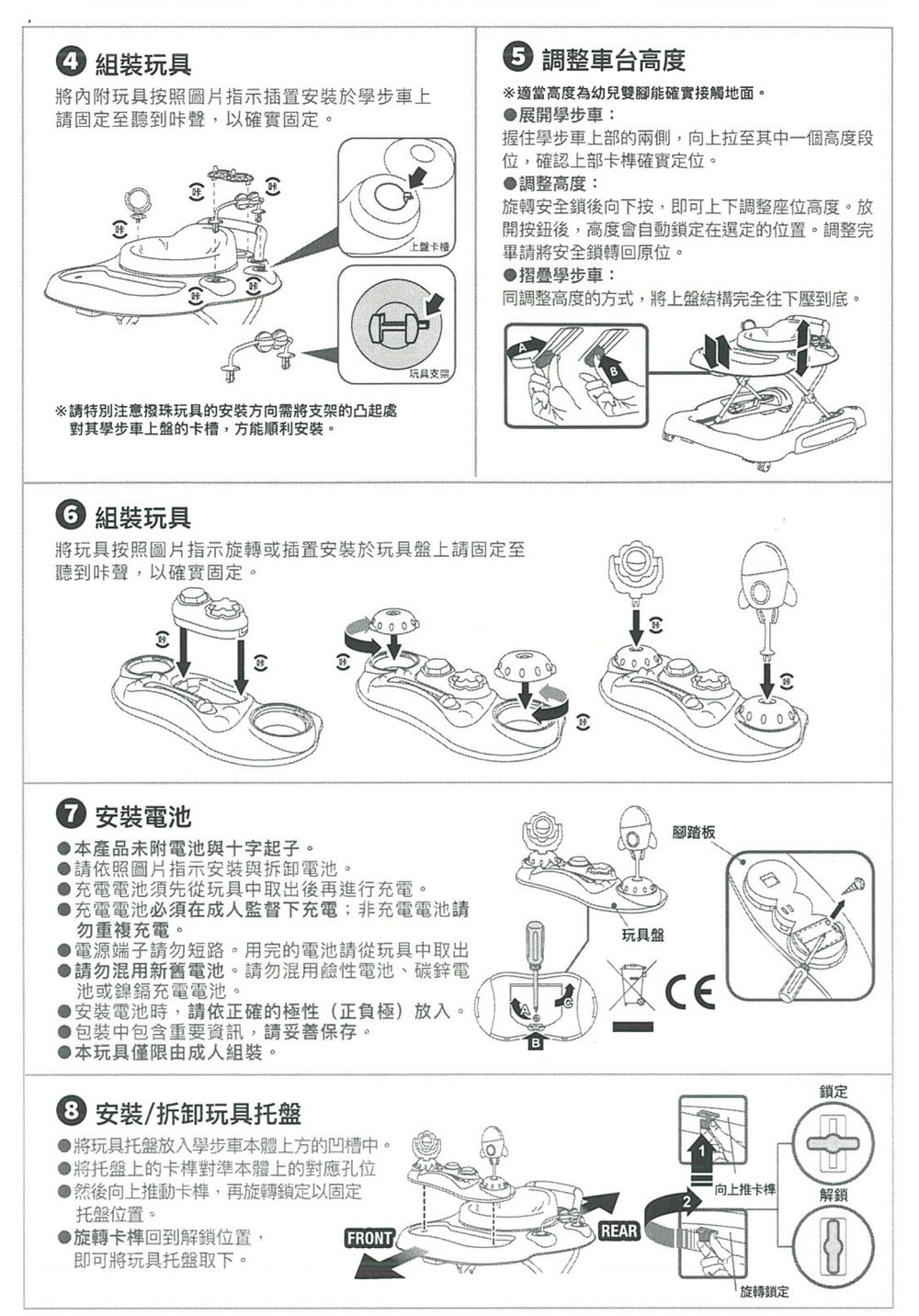 搬動學步車時,應先將嬰幼兒抱離。禁止孩童坐於學步車時,操作學步車的升降調節器。