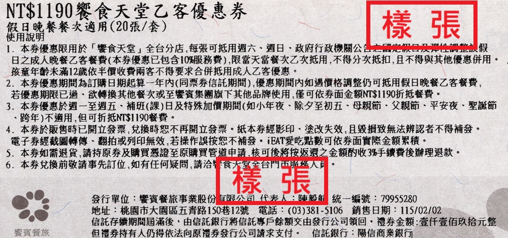 ・此為實體紙本票券,並非電子票券。票券視同有價證券,如有遺失、破損、燒毀或無法辨識等情形,恕不補發,請務必妥善保管票券。・票面價值不等同於售價。・本券優惠限用於「饗食天堂」全台分店,每張可抵用週六、週日、政府行政機關公告之國定假日及彈性調整放假日之成人晚餐乙客餐費,限當天當餐次乙次抵用,不得分次抵扣,且不得與其他優惠併用。(本券優惠已包含10%服務費)・本券優惠期間為訂購日期起算一年內(同票券信託期間),優惠期間內如遇價格調整仍可直接抵用假日晚餐乙客餐費,若優惠期限已過、欲轉換其他餐次或至饗賓集團旗下其他品牌使用,僅可依券面金額NT$1190折抵餐費。・本券優惠於週一至週五、補班(課)日及特殊加價期間(如小年夜、除夕至初五、母親節、父親節、平安夜、聖誕節、跨年)不適用,但可折抵NT$1190餐費。・孩童年齡12歲(含)以上視同成人計費,孩童年齡未滿12歲依半價收費,孩童兩客不得要求合併抵用成人乙客優惠。・本券於兌換時恕不再開立發票。・紙本券經影印、塗改失效,且毀損致無法辨認者不得補發。・本券兌換前敬請事先訂位,如有任何疑問,請洽「饗食天堂」全台門市服務人員。・本商品券無法提供換貨服務,如需其他商品請重新購買。・本券自2009/02/01起,已依行政院衛生署『餐飲業等商品(服務)禮券定型化契約』規定,對當日起銷售之禮券由銀行提供履約保證責任。・發行單位:饗賓餐旅事業股份有限公司 代表人:陳毅航