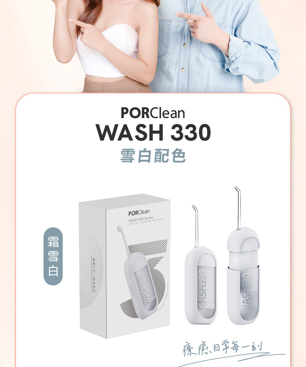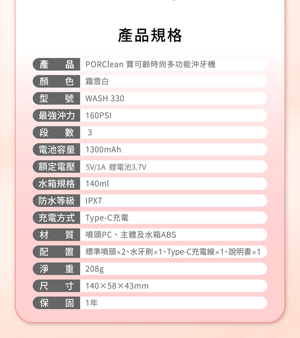 ◆型號:WASH 330◆顏色:霜雪白◆商品尺寸:140 x 58 x 43 mm◆商品重量:208g◆商品材質:ABS、PC◆額定電壓:5V1A◆電池規格:1300mAh◆水箱容量:140ml◆防水等級:IPX7◆配件:標準噴頭x2、水牙刷x1、TYPE-C充電線x1、說明書x1◆產地:中國◆商檢字號:免驗◆效期(未拆封):無效期◆國際條碼:4711027055626◆保固:主機保固1年◆消費者服務電話:0800-380-850 (請於上班日每週一至週五09:00-12:00、13:00-17:00撥打,將會有專人為您服務,謝謝)