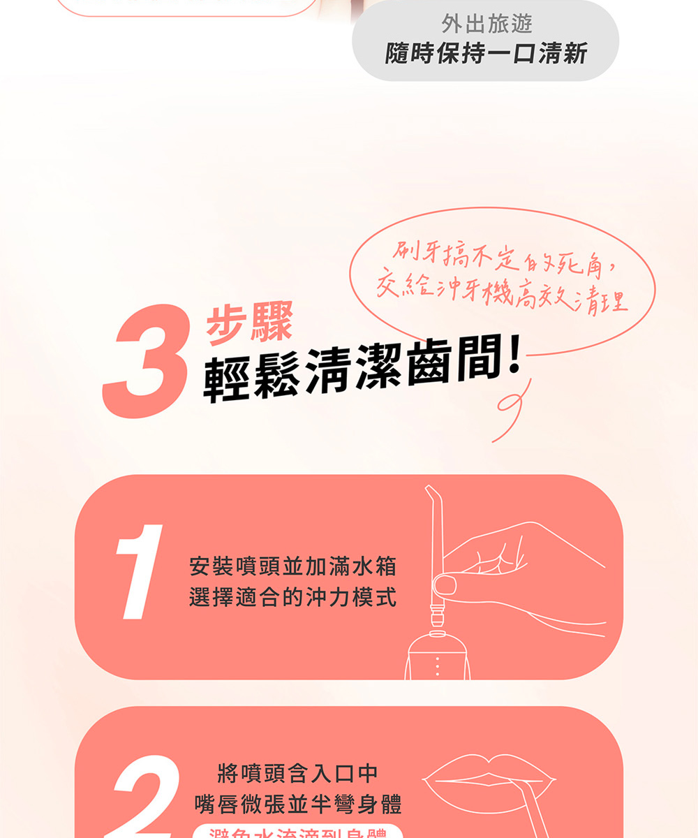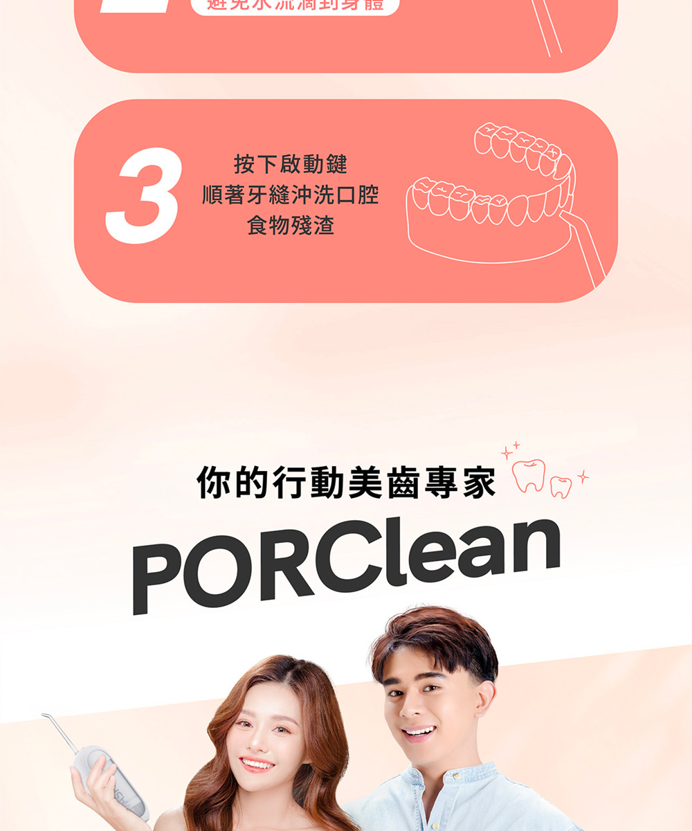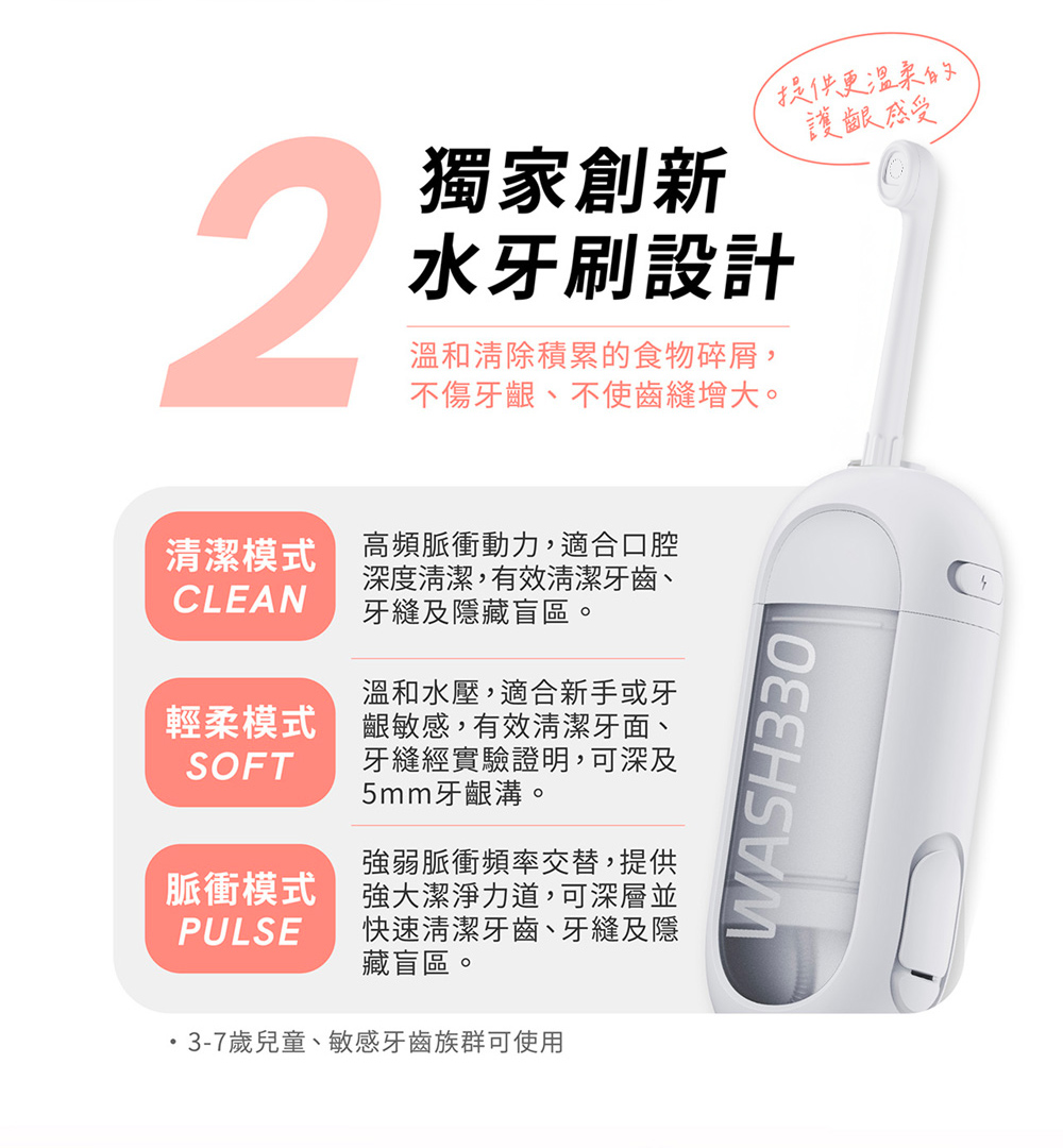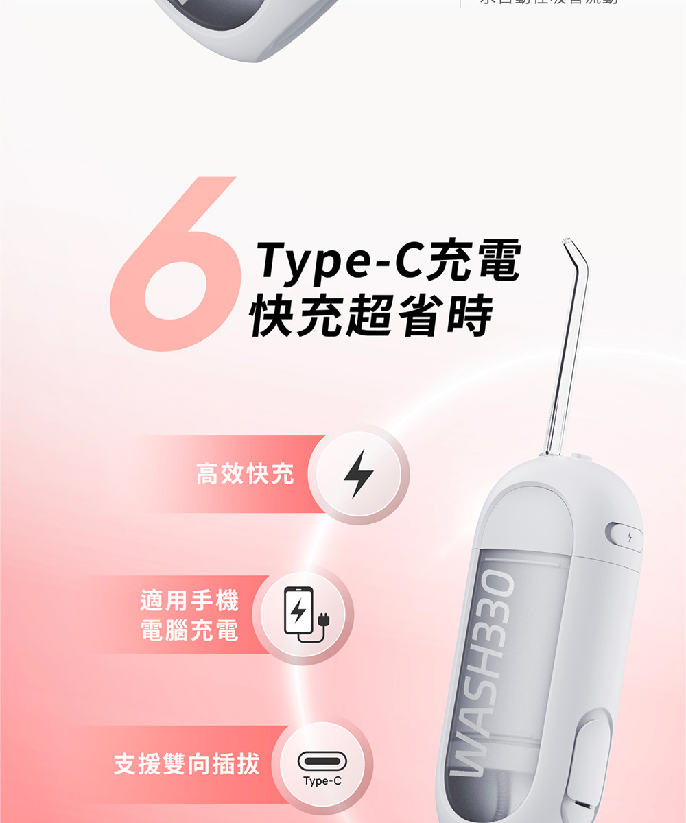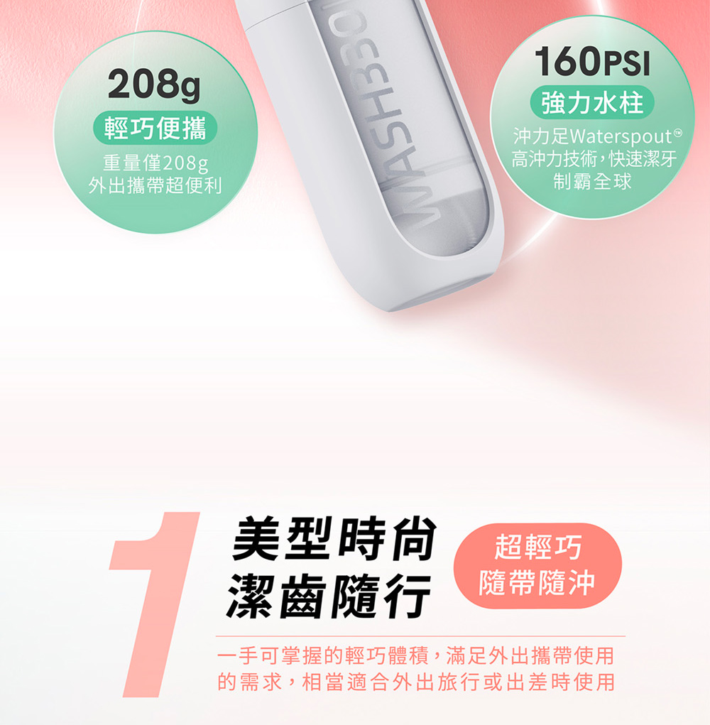 ◆60秒快速潔牙,3種清潔模式◆僅208g+比手機還小,適合外出/旅行◆新一代水龍捲泵浦技術,160PSI超大沖力◆獨創水牙刷,溫和清潔不傷牙齦◆Type-C高效快充超省時