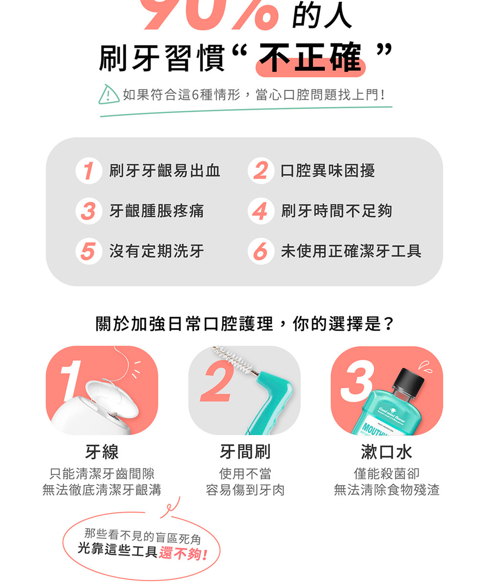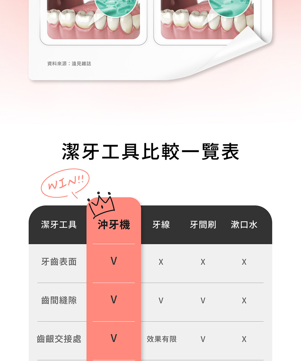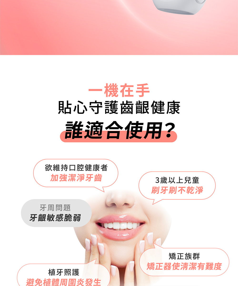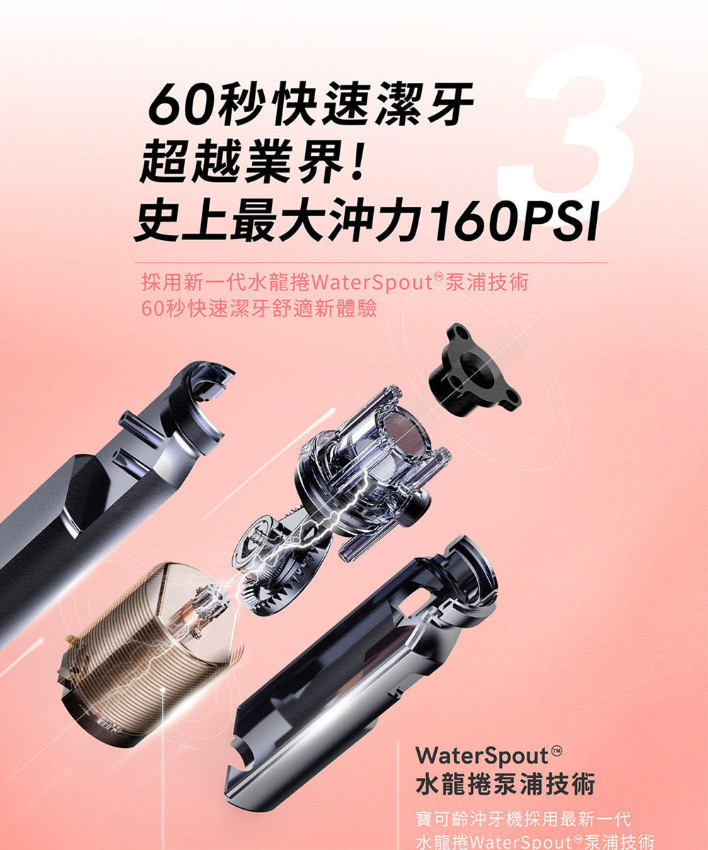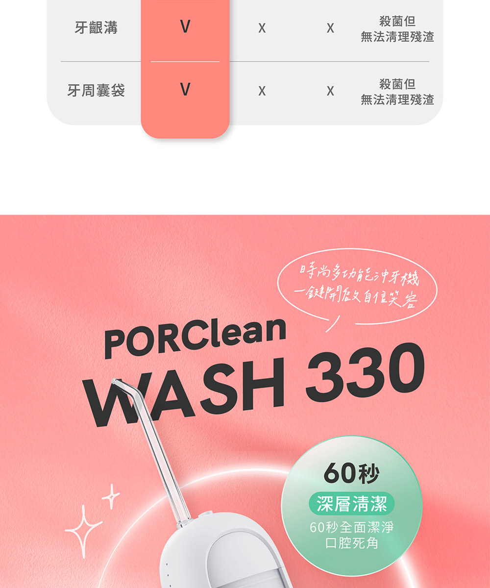 ◆60秒快速潔牙,3種清潔模式◆僅208g+比手機還小,適合外出/旅行◆新一代水龍捲泵浦技術,160PSI超大沖力◆獨創水牙刷,溫和清潔不傷牙齦◆Type-C高效快充超省時