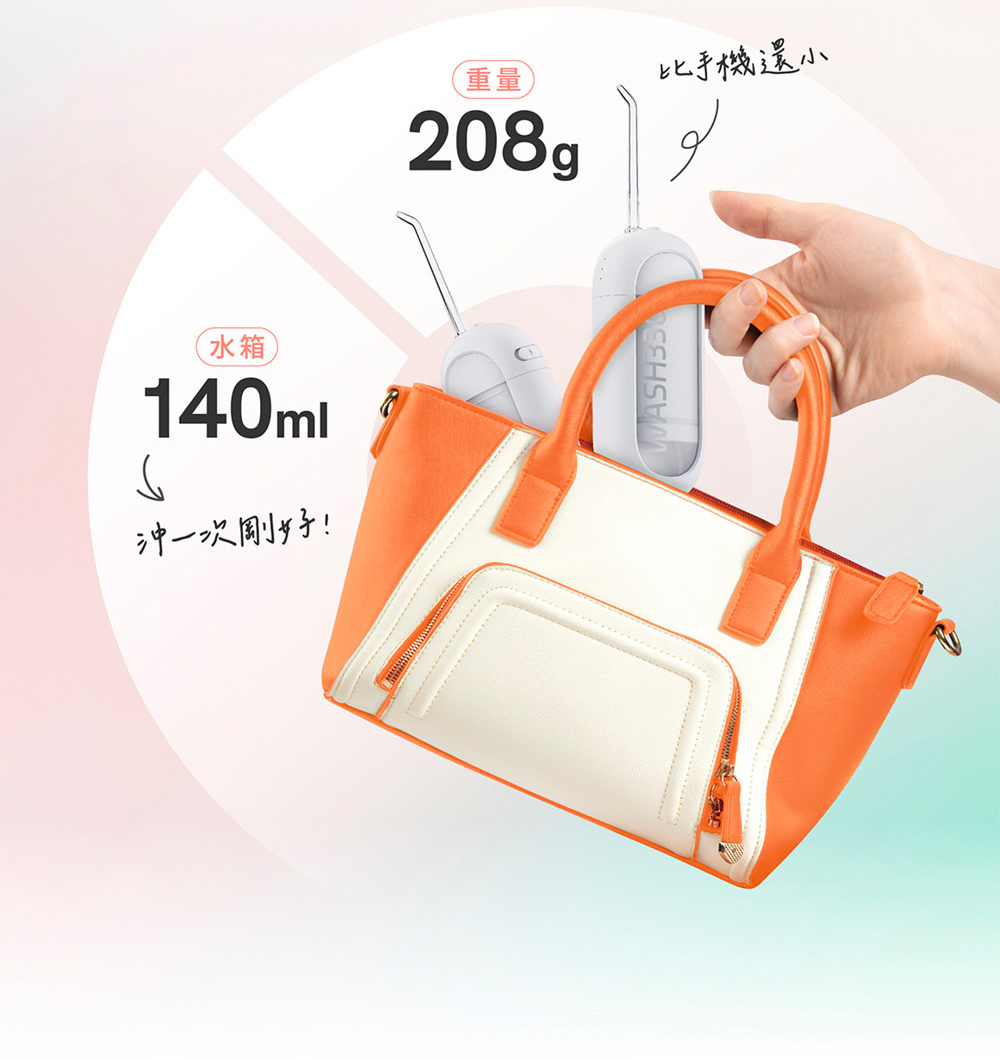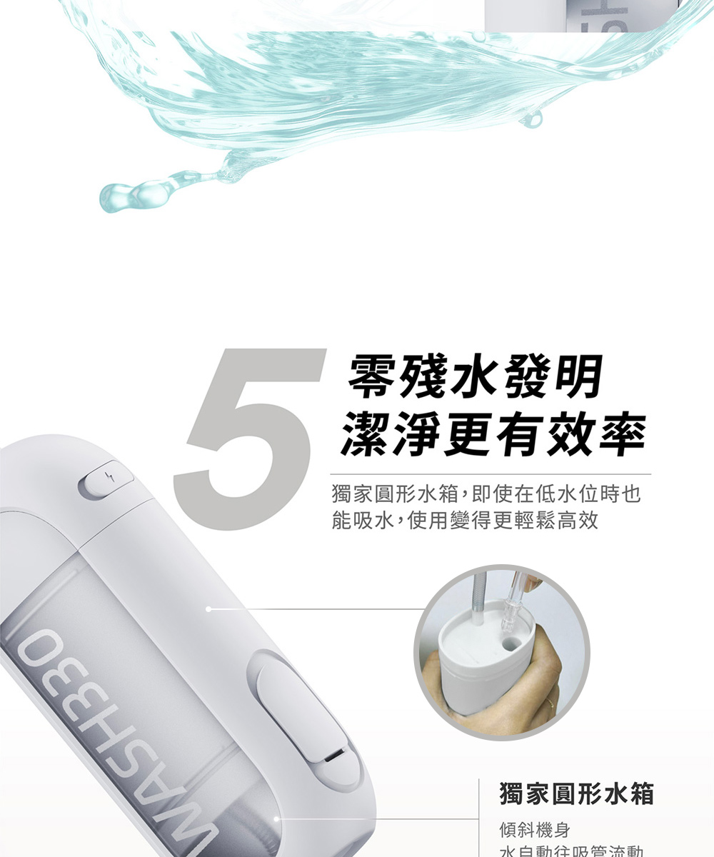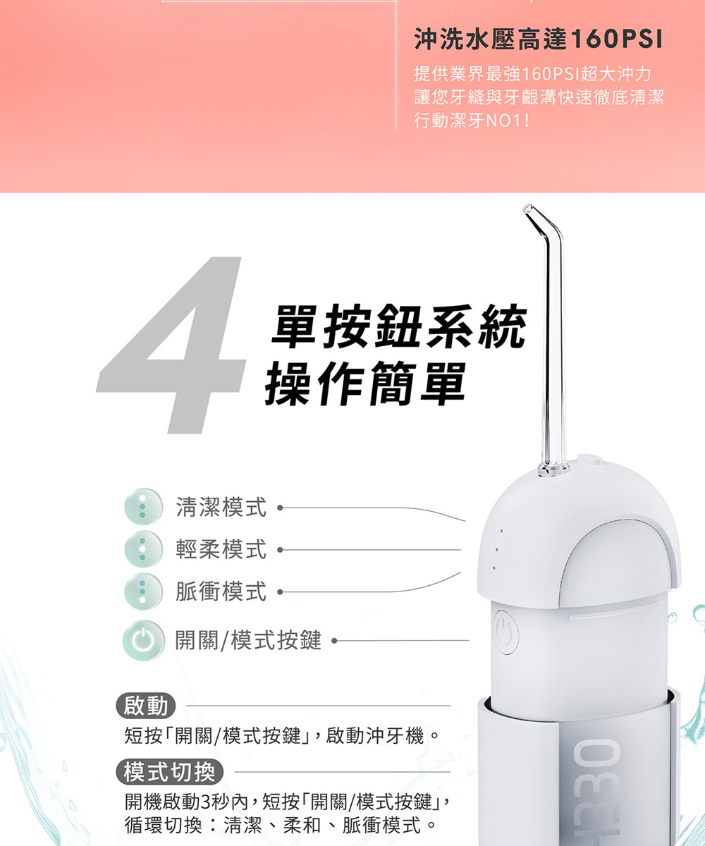 ◆60秒深層清潔,全面潔淨口腔死角。◆一手掌握的輕巧體積,僅208g、比手機還小,適合外出/旅行/出差使用。◆史上最大沖力160PSI,採用新一代水龍捲WaterSpout泵浦技術。◆獨創水牙刷,溫和清除食物殘渣,不傷牙齦、齒縫不增大。◆清潔、輕柔、脈衝,3種清潔模式可選擇。◆單按鈕系統,操作簡單,短按開關/模式鍵可循環切換模式。◆獨家圓形水箱,低水位也能吸水,零殘水潔淨更有效率。◆Type-C高效快充超省時,適用手機、電腦充電。◆隨身攜帶的貼心設計,抽出水箱即可將噴頭收納於機身底部!