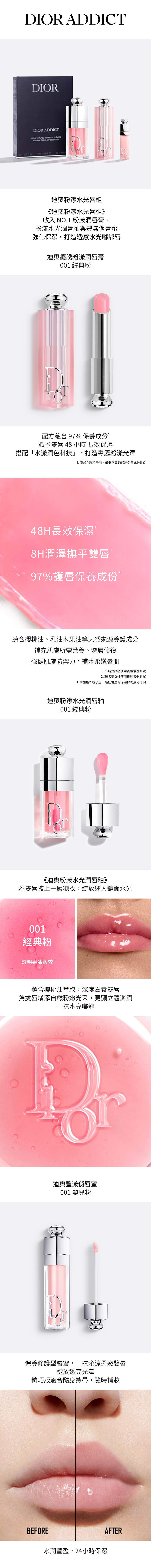 迪奧粉漾水光潤唇釉 #001 經典粉 6ml蘊含櫻桃油萃取,深度滋養雙唇,為雙唇增添自然粉嫩光采,更顯立體澎潤,一抹水亮嘟翹。迪奧豐漾俏唇蜜 #001 嬰兒粉 2ml保養修護型唇蜜,一抹沁涼柔嫩雙唇,綻放透亮光澤。精巧版適合隨身攜帶,隨時補妝。