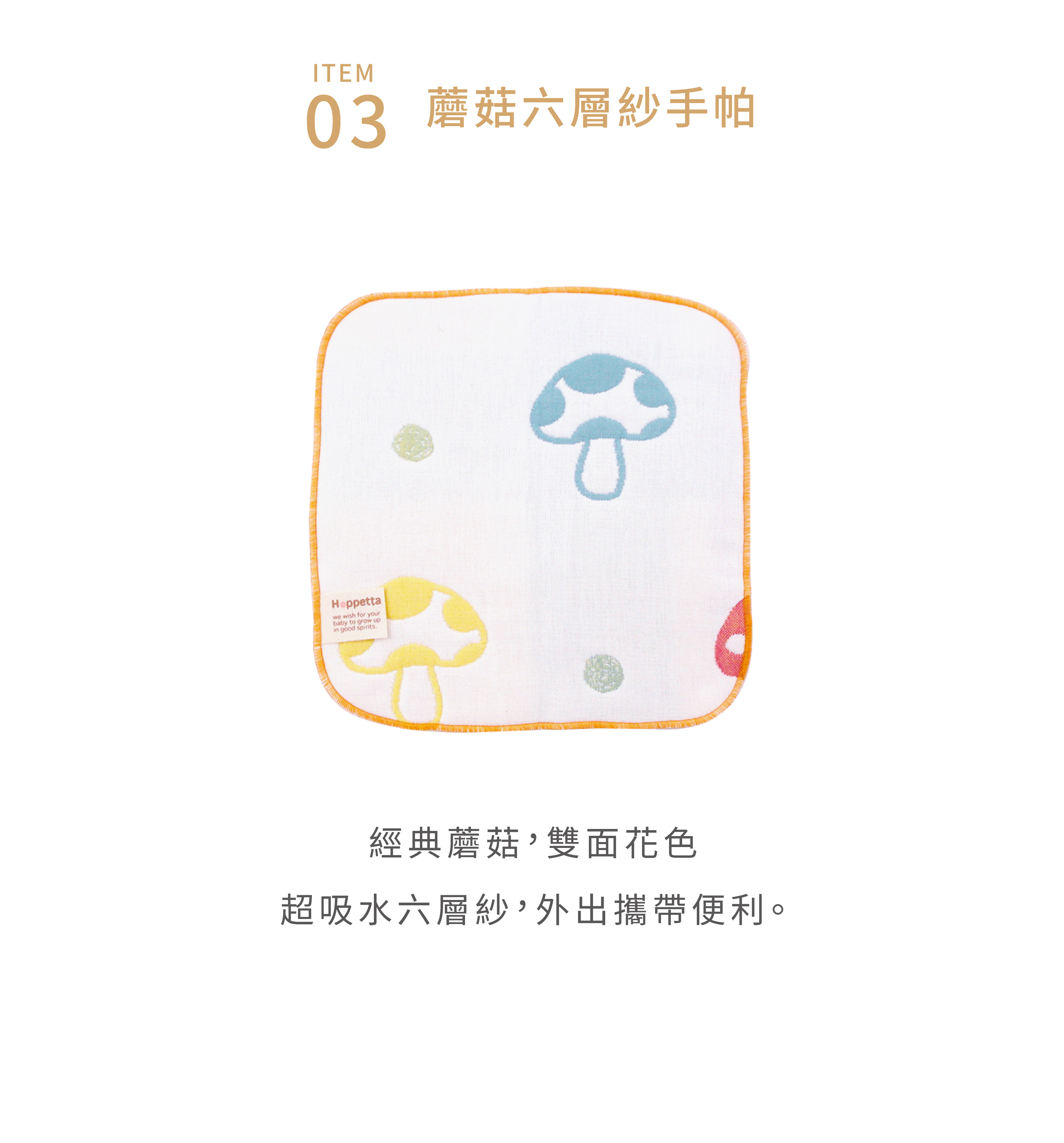 ●搭配經典六層紗手帕 透氣、吸水、速乾