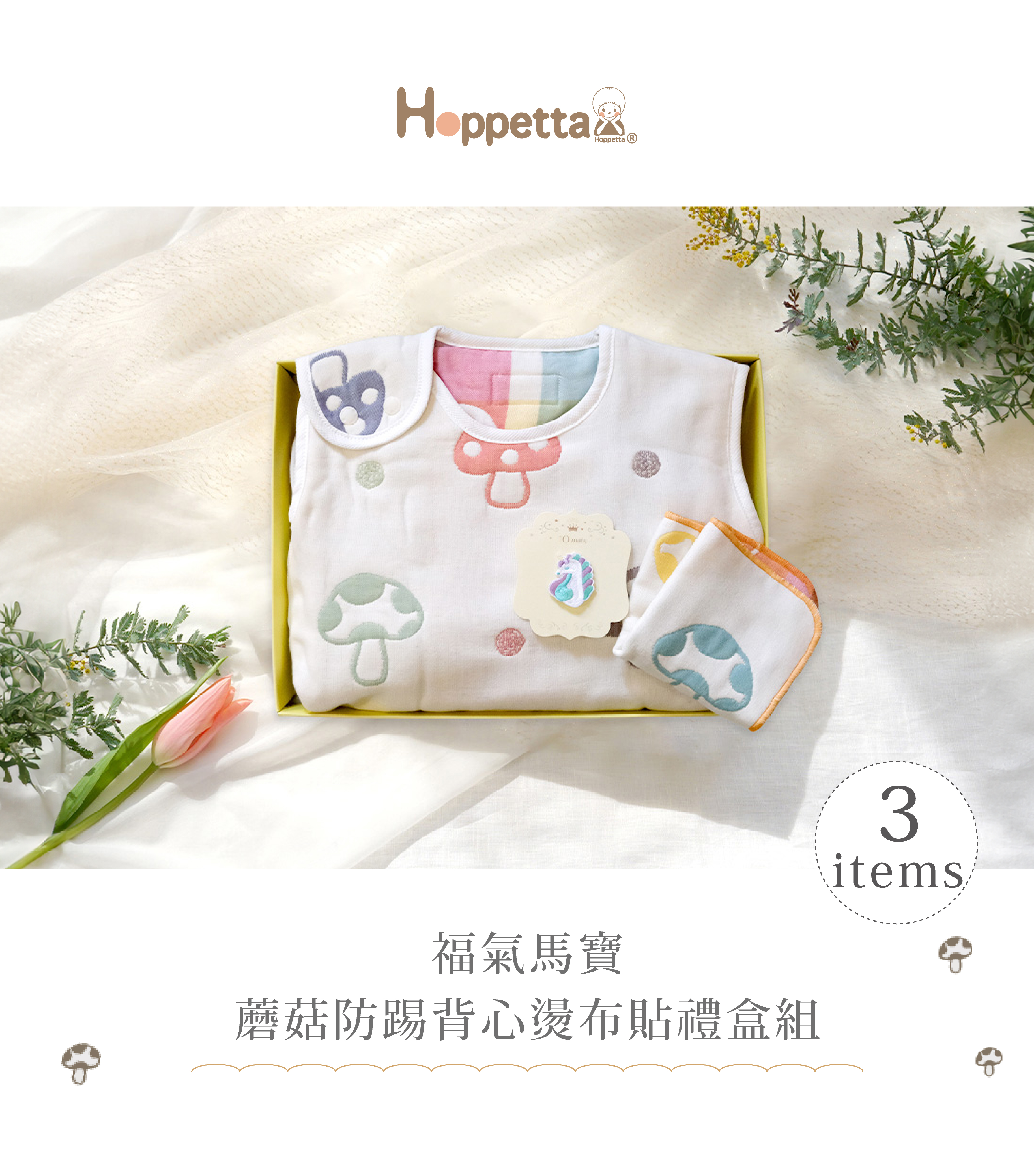 ●內容物:蘑菇六層紗防踢被x1、蛇年燙布貼x1、蘑菇手帕x1