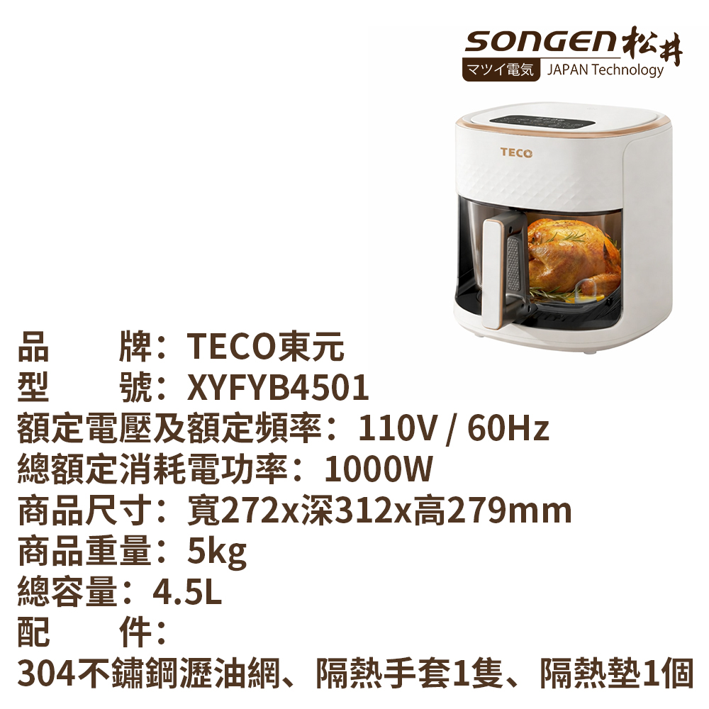 ✦東元超大容量氣炸鍋,可視安全放心便利✦透明玻璃全景可視,無須反覆掀開查看✦3D全方位熱旋循環,均勻烘烤外酥內嫩✦無油低脂健康美味,低油煙好吃不上火✦廣域控溫不止空炸,多功能料理更食趣✦食品級高硼矽玻璃,一體成型安全耐用✦高清晰觸控屏幕,操作簡單一鍵就啟動✦五種烹調功能選單,自動料理秒變大廚✦1~24小時預約功能,掌控時間隨心料理✦4.5L家享大容量,創意豐富美食不受限✦內置先進感溫探頭,靈敏檢測智能溫控✦簡約設計悅人悅己,亮麗金色框邊搭配✦油汙不黏一沖即淨,無塗層容易更清洗✦炸鍋抽出自動斷電,隨時加料方便料理✦BSMI商品認證字號:R73998