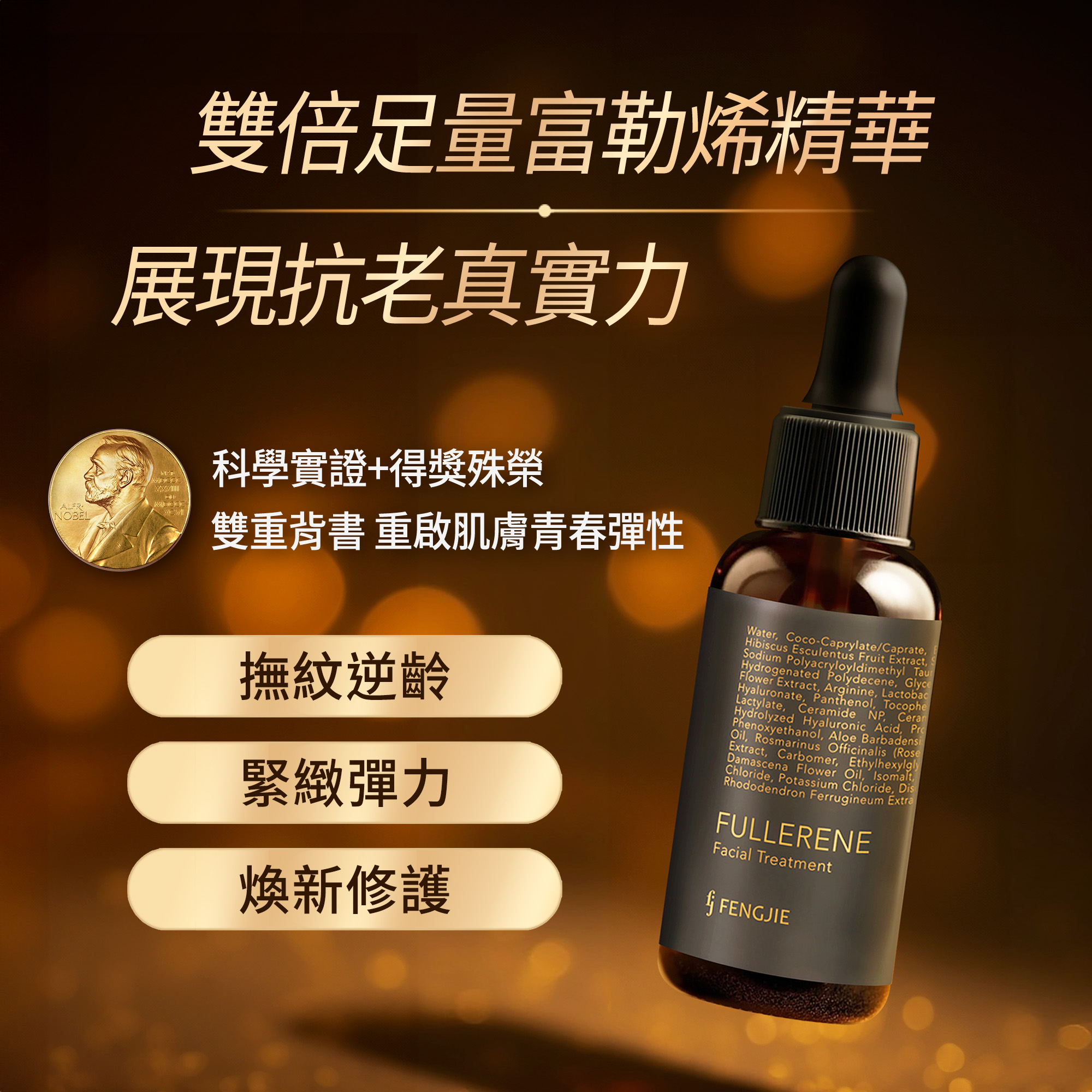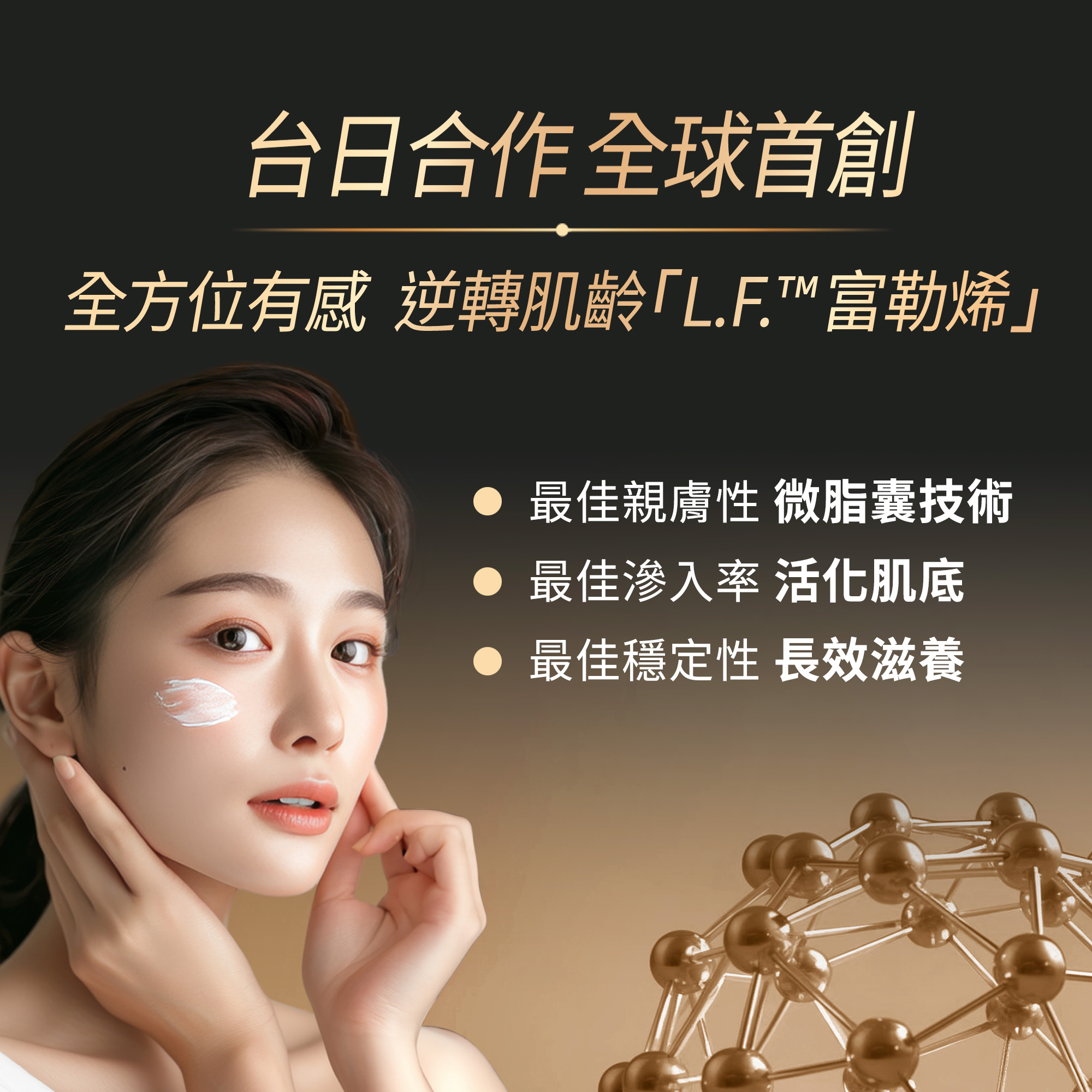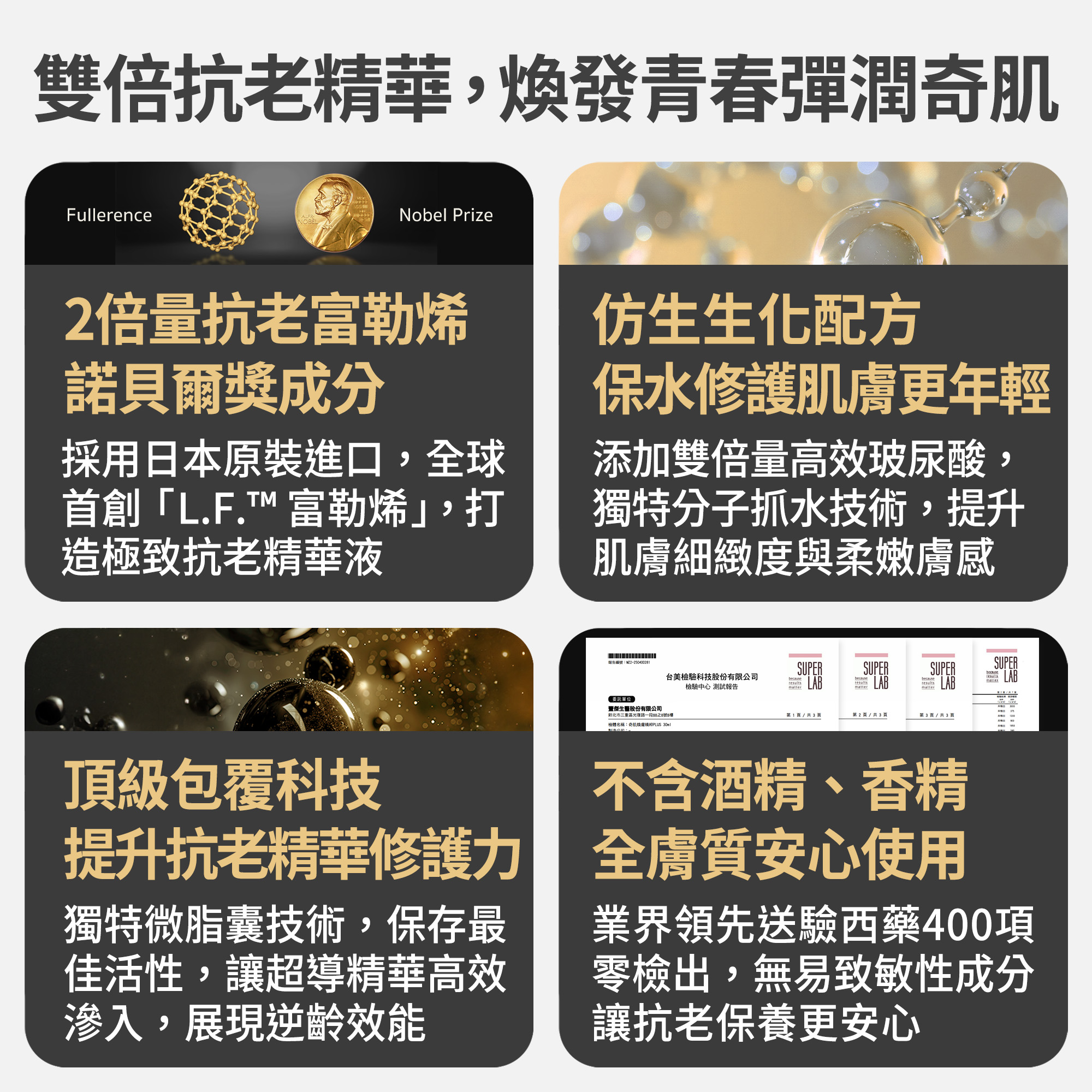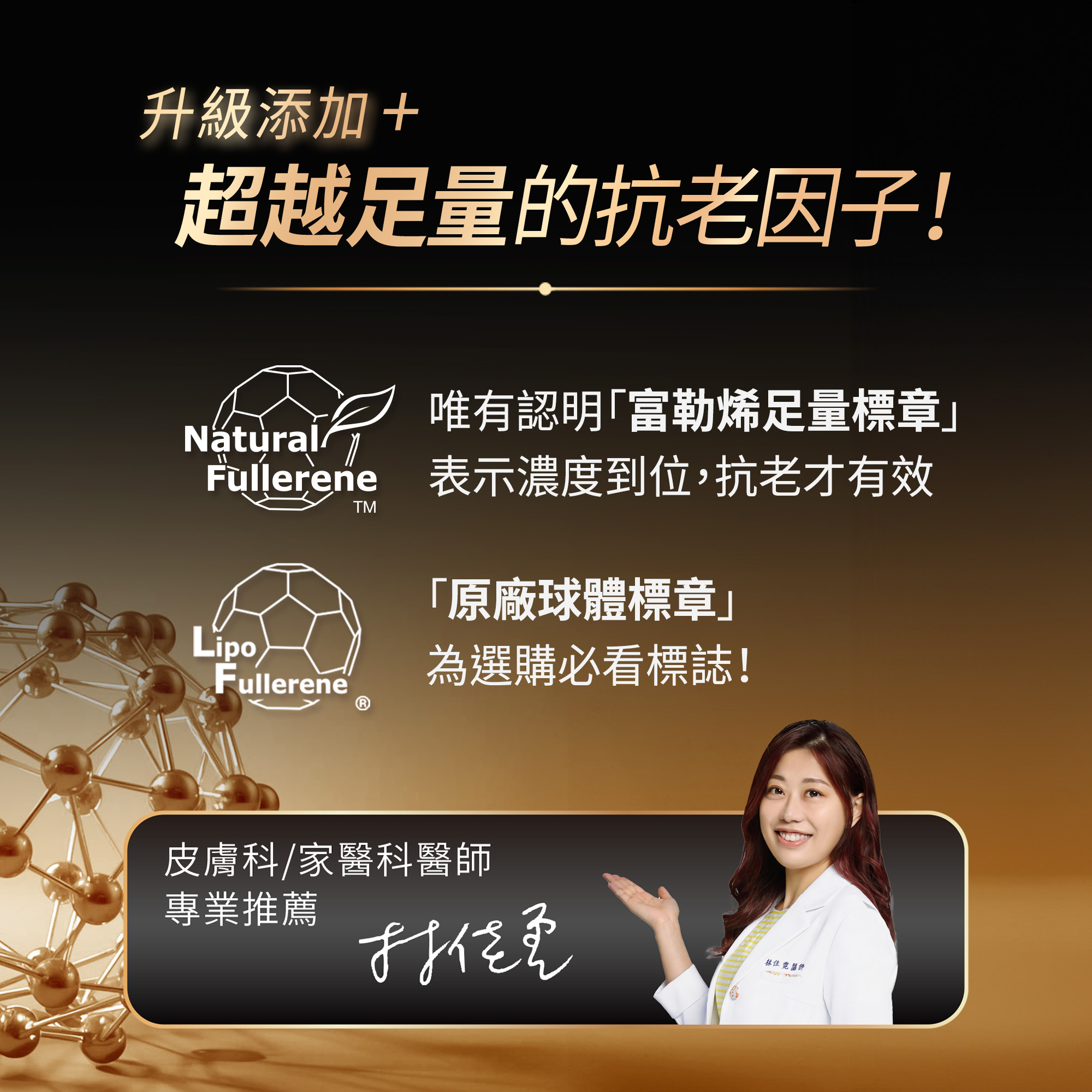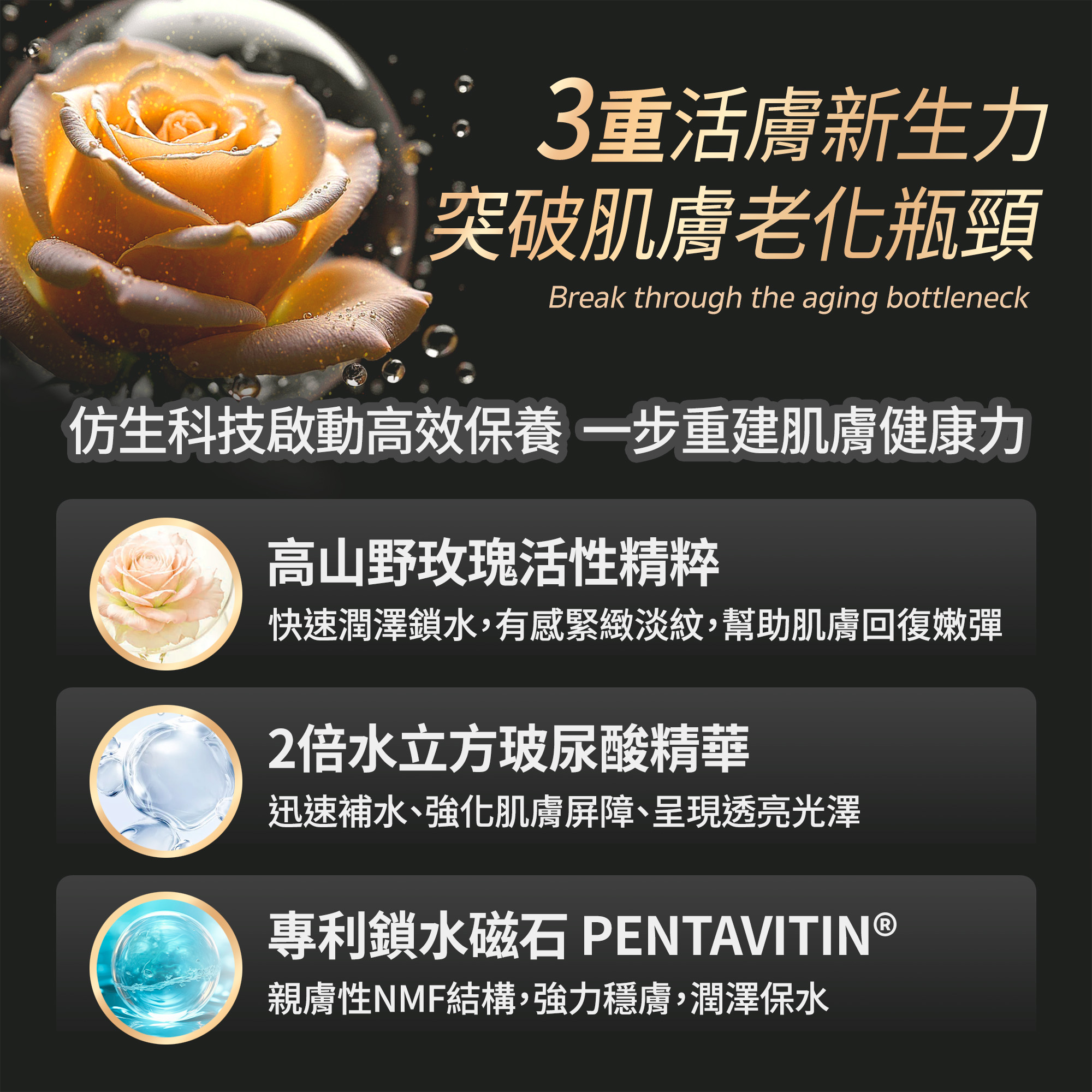 榮獲諾貝爾抗老原料富勒烯【市面最高濃度添加】,搭配獨家特殊培育玫瑰精華、雙倍高濃度水立方透明質酸精準深入肌底。