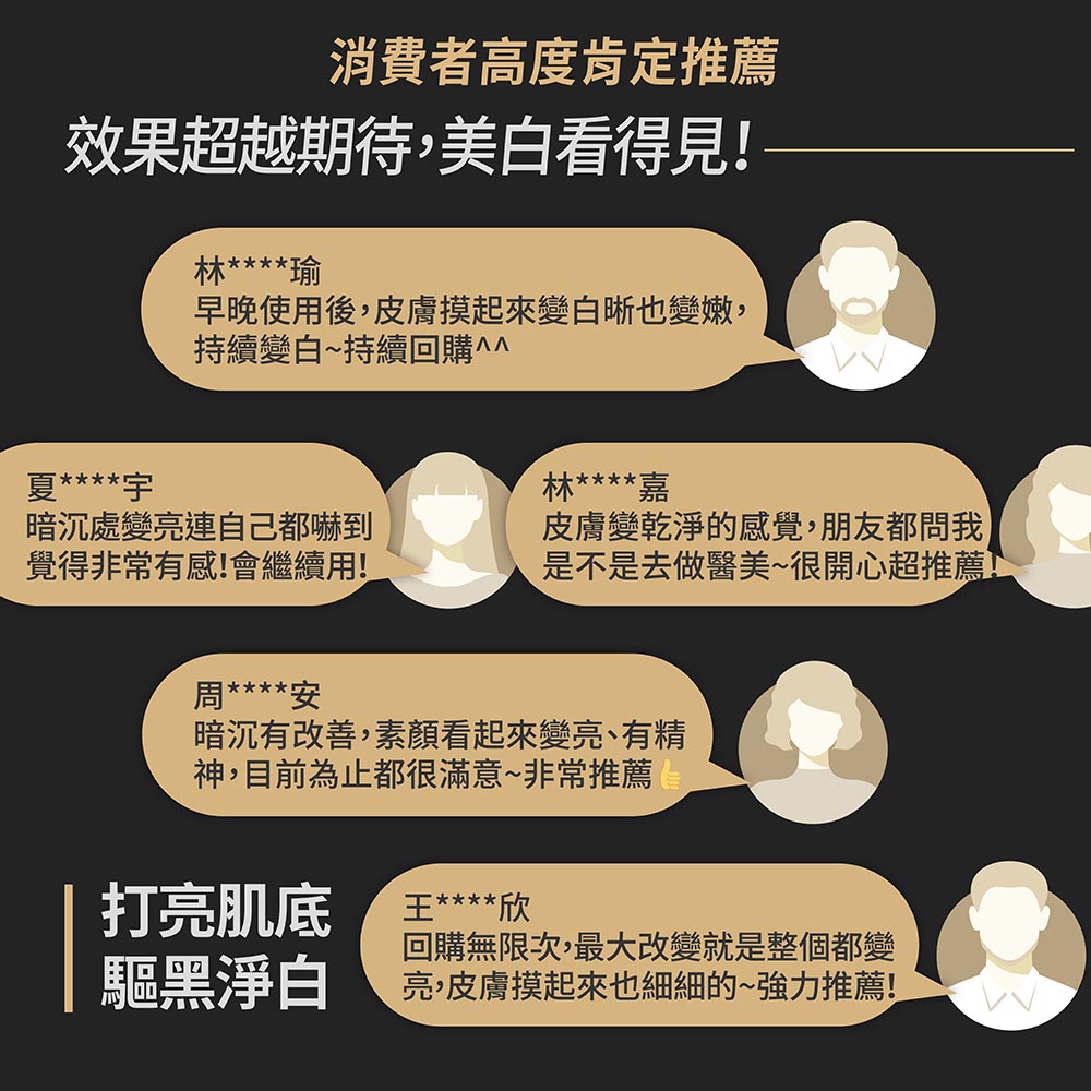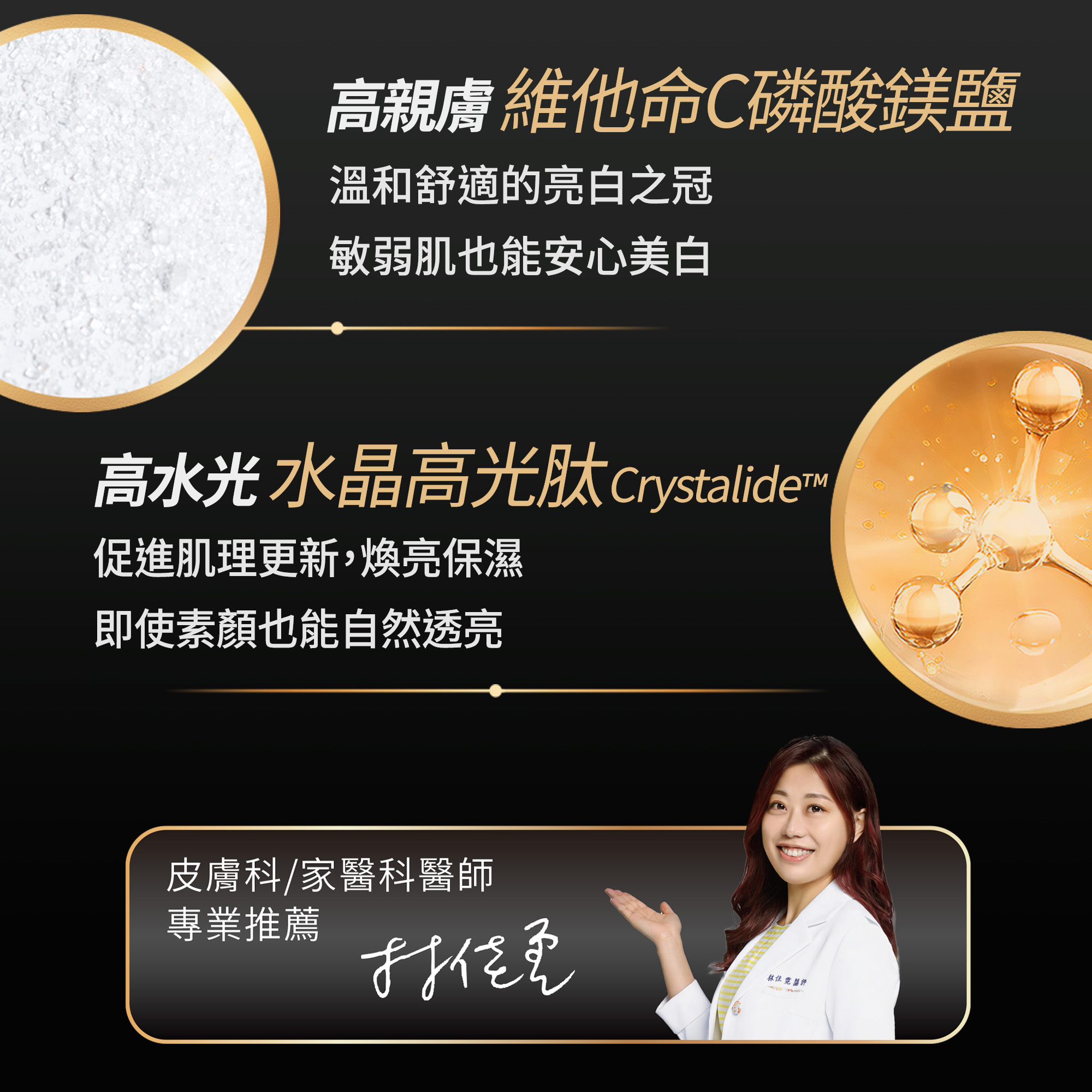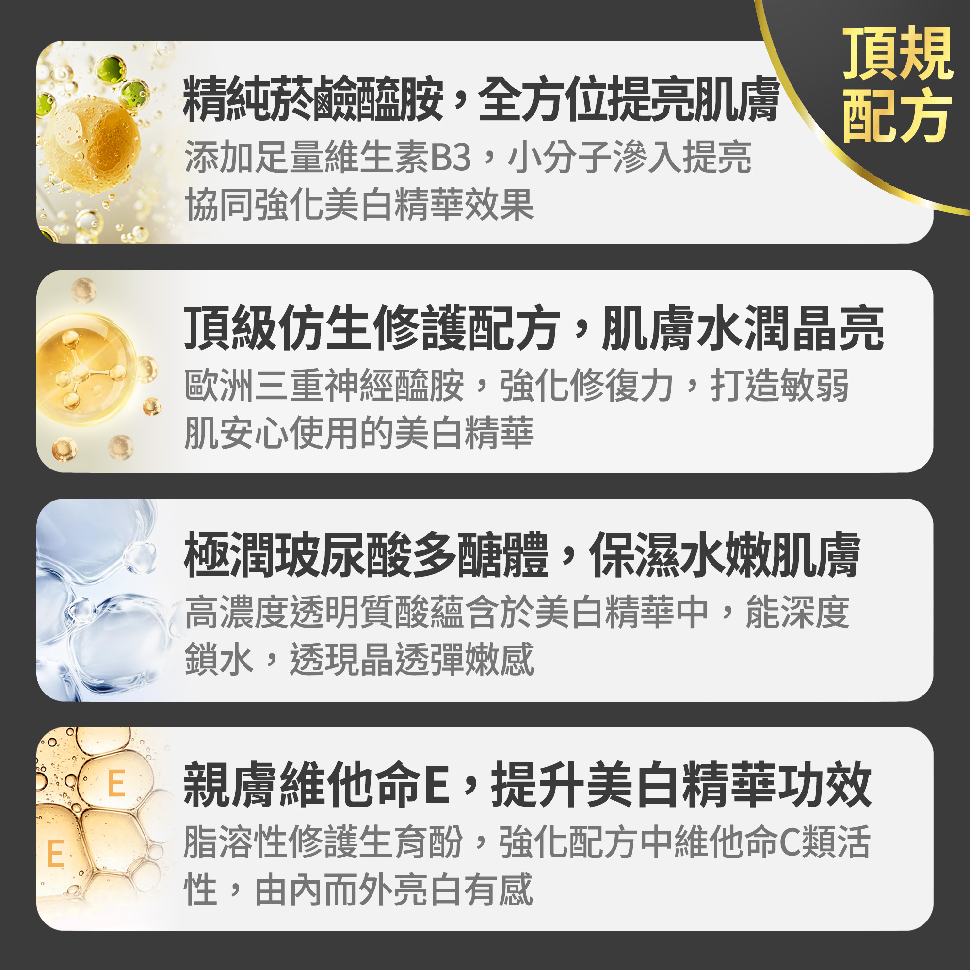 添加三大法定美白成分,有效打擊肌膚暗沉、斑點,改善蠟黃等肌膚問題,並添加小分子胜肽、植萃活性等舒緩彈嫩配方,驅黑淨白展現亮麗美肌。