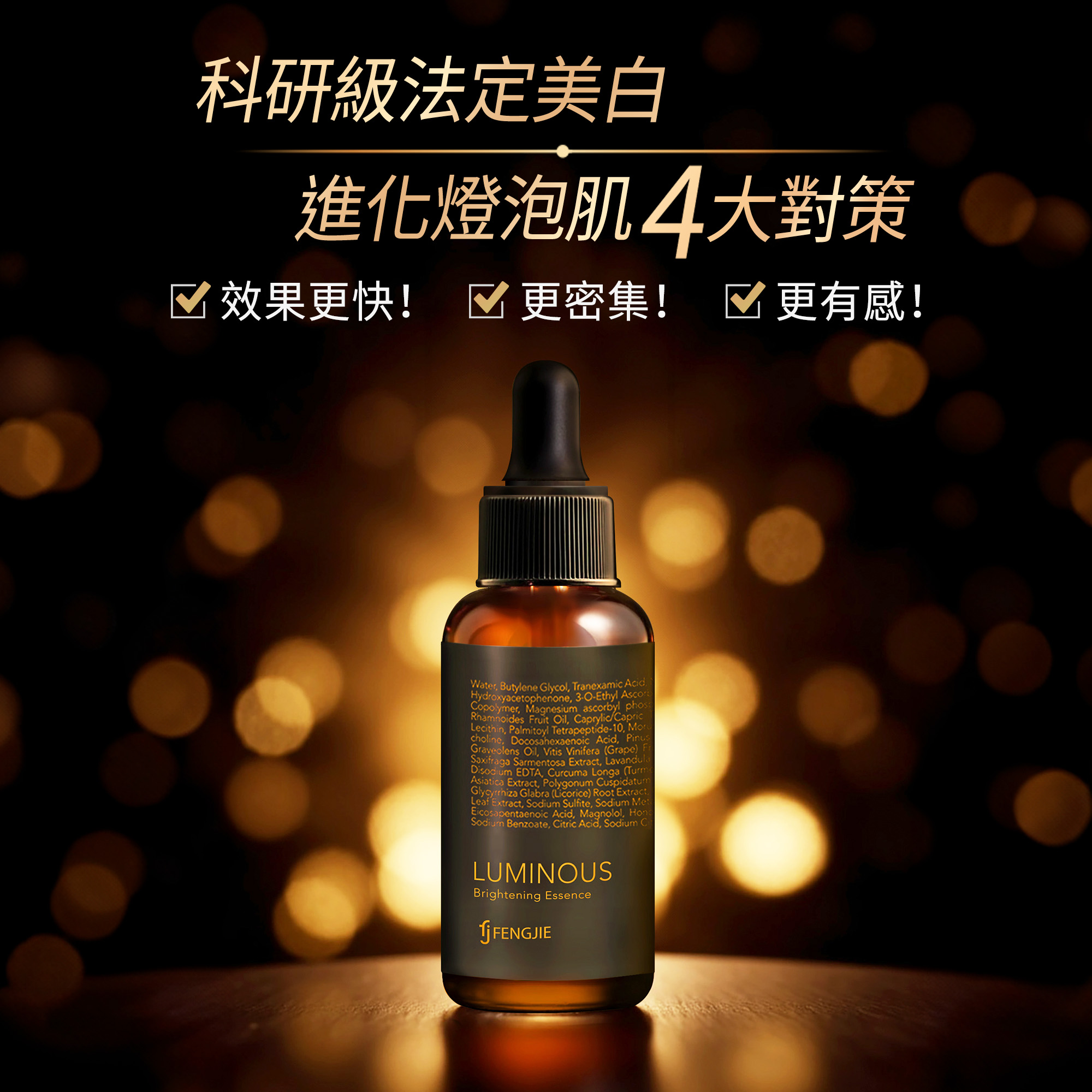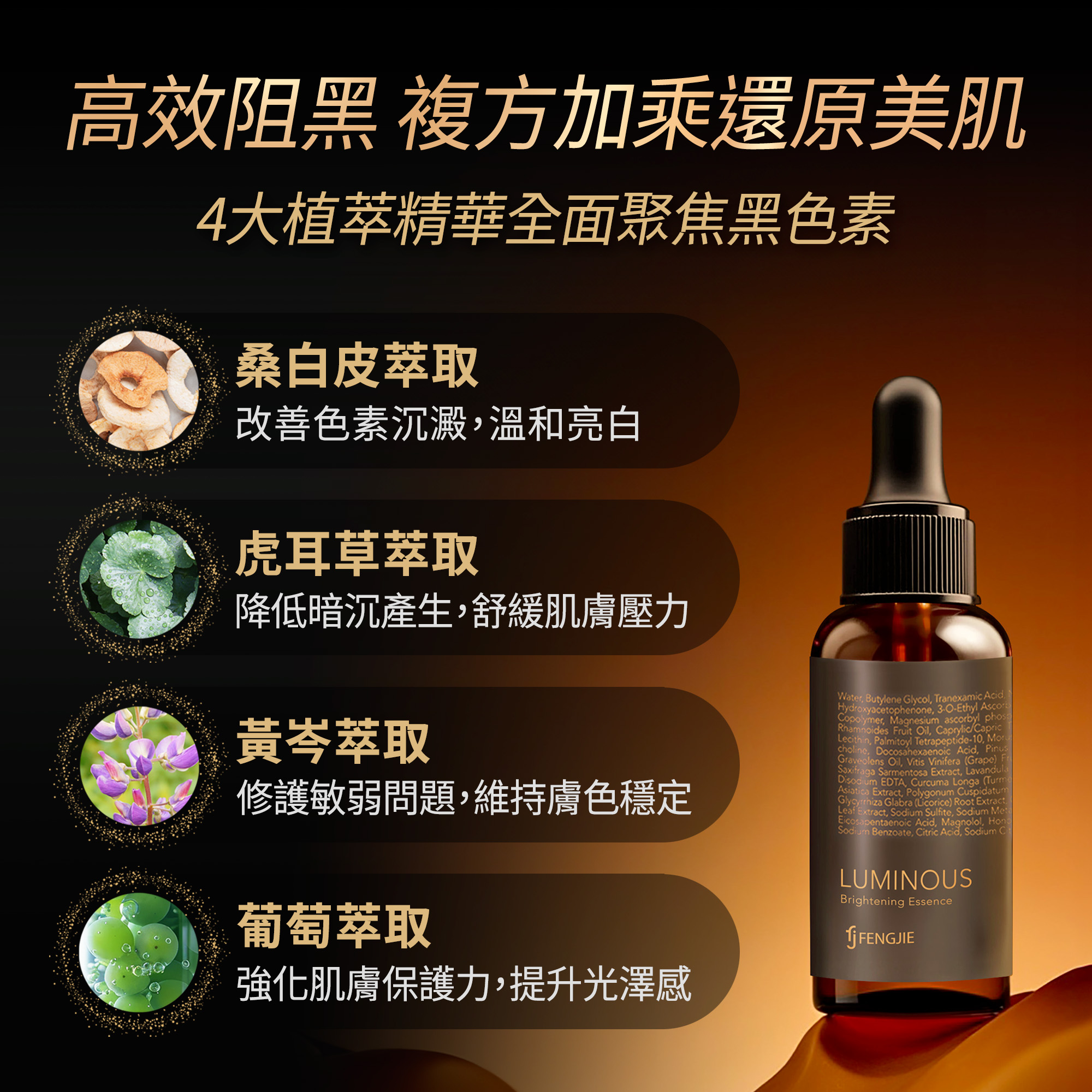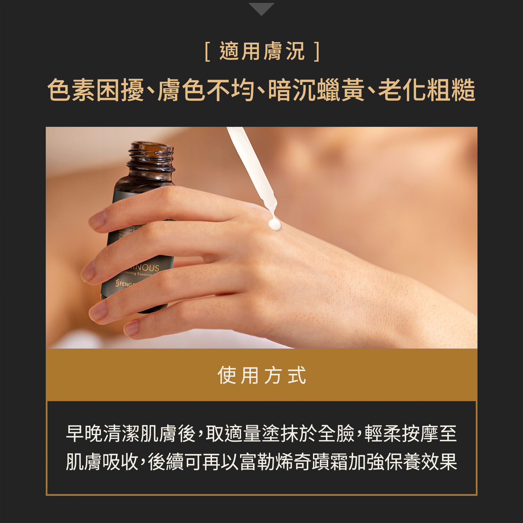 添加三大法定美白成分,有效打擊肌膚暗沉、斑點,改善蠟黃等肌膚問題,並添加小分子胜肽、植萃活性等舒緩彈嫩配方,驅黑淨白展現亮麗美肌。