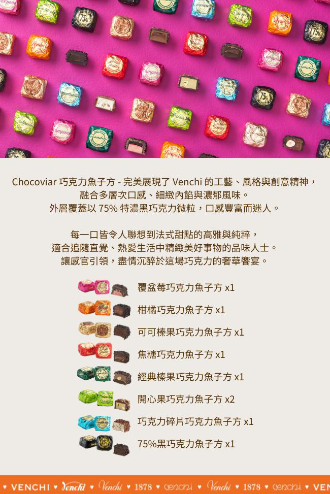 柑橘巧克力魚子方 x1可可奶油巧克力魚子方 x1焦糖巧克力魚子方 x1經典榛果巧克力魚子方 x1覆盆莓巧克力魚子方 x1巧克力碎片巧克力魚子方 x1入75%黑巧克力魚子方 x1開心果巧克力魚子方 x2