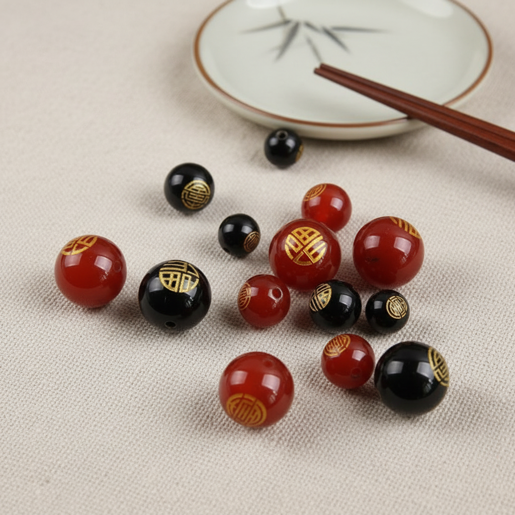 珠體打磨圓潤,孔洞精準圓滑,不傷線材。燙金字樣持久不易脫落,金紅、金黑的強烈對比,讓整體飾品更顯大氣與精緻。