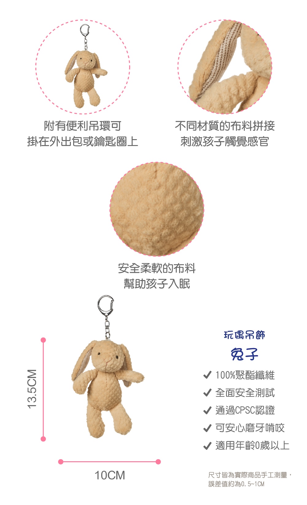 陪伴讓寶寶臉上綻放笑容●附有便利吊環,可掛在外出包或鑰匙圈上。去哪裡都能把喜歡的角色帶在身邊●小巧比例不佔空間,獨特造型也能增加辨識度●細節精緻的絨毛造型,採用安心布料,蓬鬆度與柔軟度恰到好處●尺寸與功能都符合日常需求,送禮自用都剛剛好