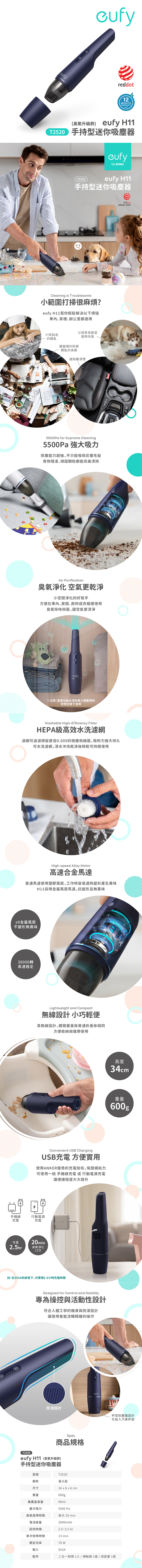 ▎型號 : T2520▎顏色 : 暮光藍▎尺寸 : 34 x 6 x 6 cm▎重量 : 0.6kg▎集塵盒容量 : 90ml▎最大吸力 : 5500 Pa▎臭氧使用時間 : 每次 20 min▎電池容量 : 2000mAh▎回充时間 : 2.5~3.5 hr▎單次使用時間 : 13 min▎额定功率 : 70 W▎輸入 : 5V2A▎配件 : 二合一刷頭1入/傳輸線1條/保證書1張