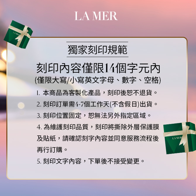 【獨家刻印規範】刻印內容僅限14個字元內 (僅限大寫/小寫英文字母、數字、空格)刻印注意事項 ▶1. 本商品為客製化產品,刻印後恕不退貨 2. 刻印訂單需要4~7個工作天(不含假日)出貨3. 刻印位置固定於乳霜15ml蓋子上面,恕無法另外指定區域