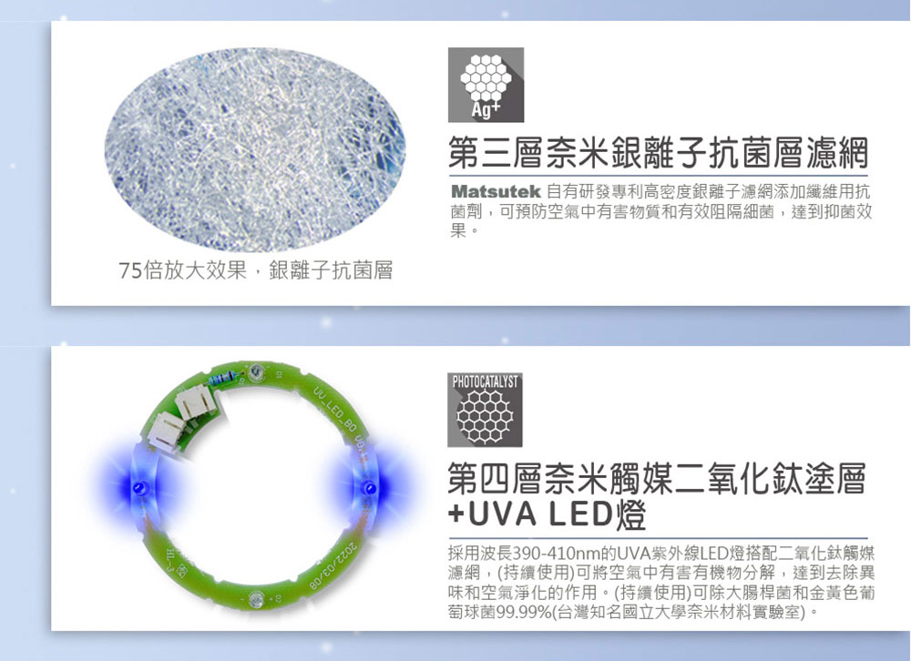 ◆智能一鍵啟動,4層防護徹底淨化。◆極速漩渦風道技術,超大風量提升室內空氣循環。◆三段風力選擇,第二段風量開始啟動UVA紫外線+光觸媒。◆採用UVA紫外線+光觸媒,持續使用可去除異味,並除大腸桿菌、金黃葡萄球菌99.99%。◆高密度銀離子濾網,可有效阻斷空氣中有害物質及細菌,達到殺菌效果。◆活性碳除臭濾網,讓空氣清新芬芳。◆BLDC無刷直流節能馬達,電氣雜訊少、噪音低、超節能。◆台灣製造,品質保證。