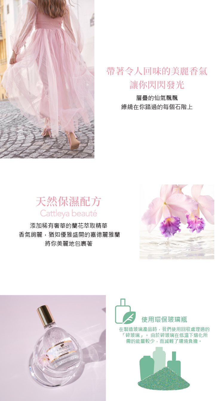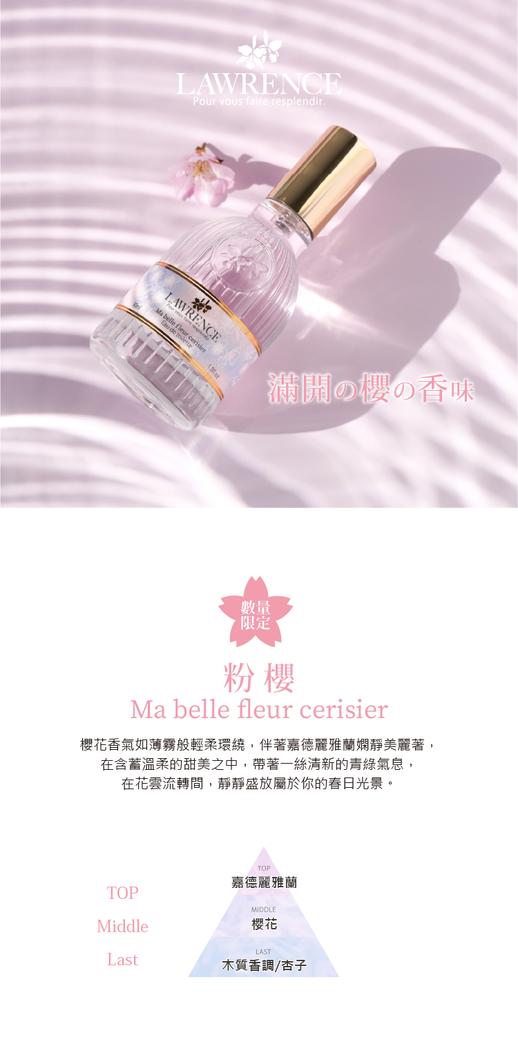 LAWRENCE柔綸絲-粉櫻 閃耀淡香水30ml香調前調:嘉德麗雅蘭中調:櫻花後調:木質香調、杏子