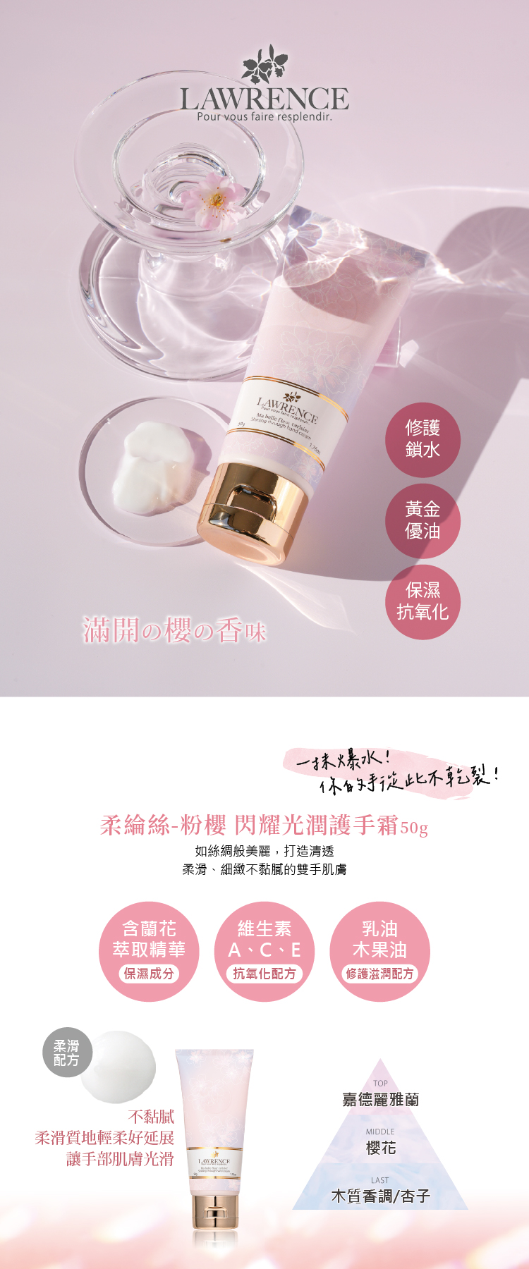 LAWRENCE柔綸絲-粉櫻 閃耀光潤護手霜50g◆香調