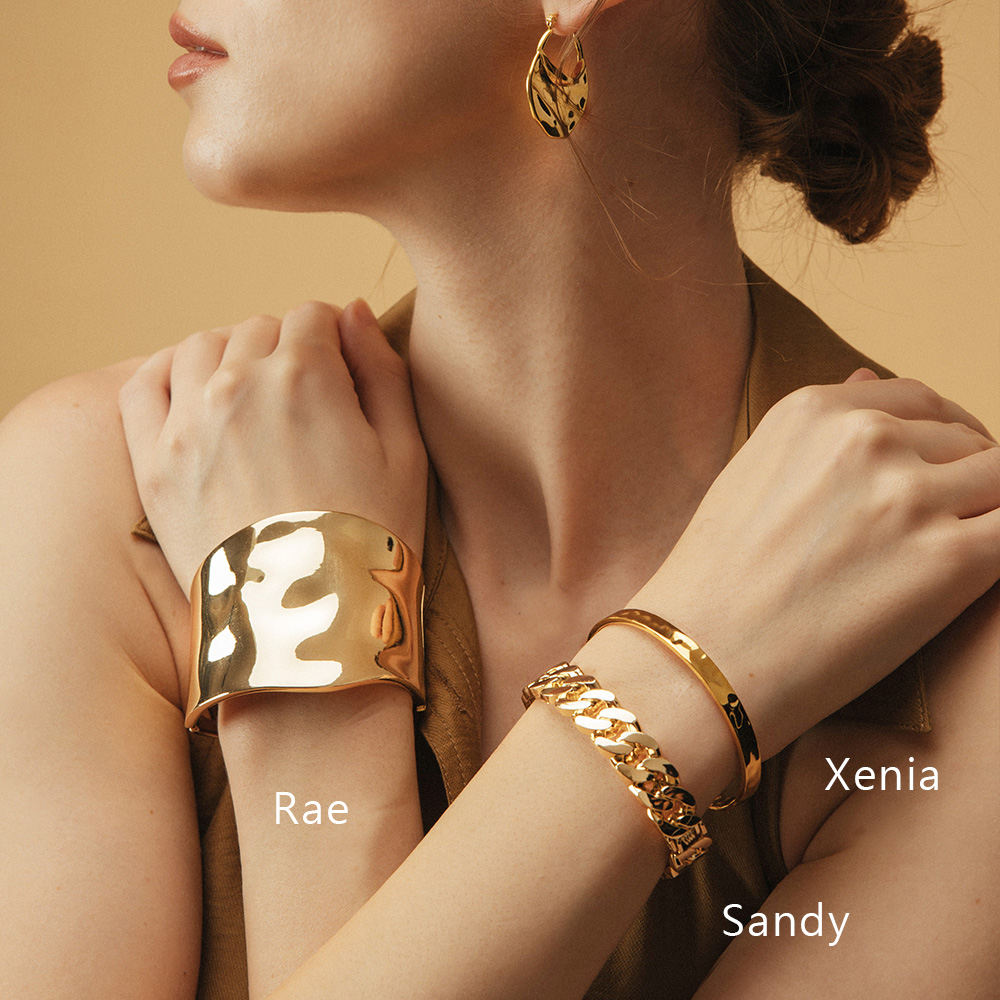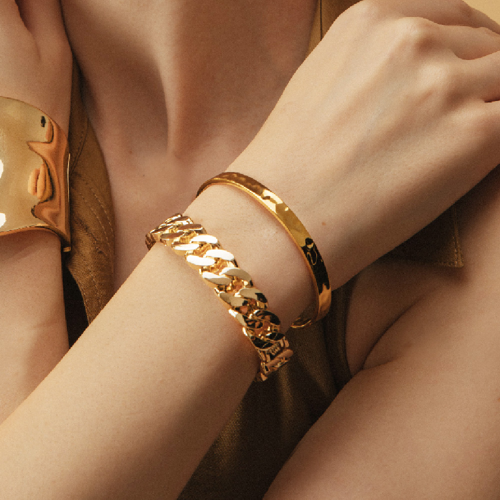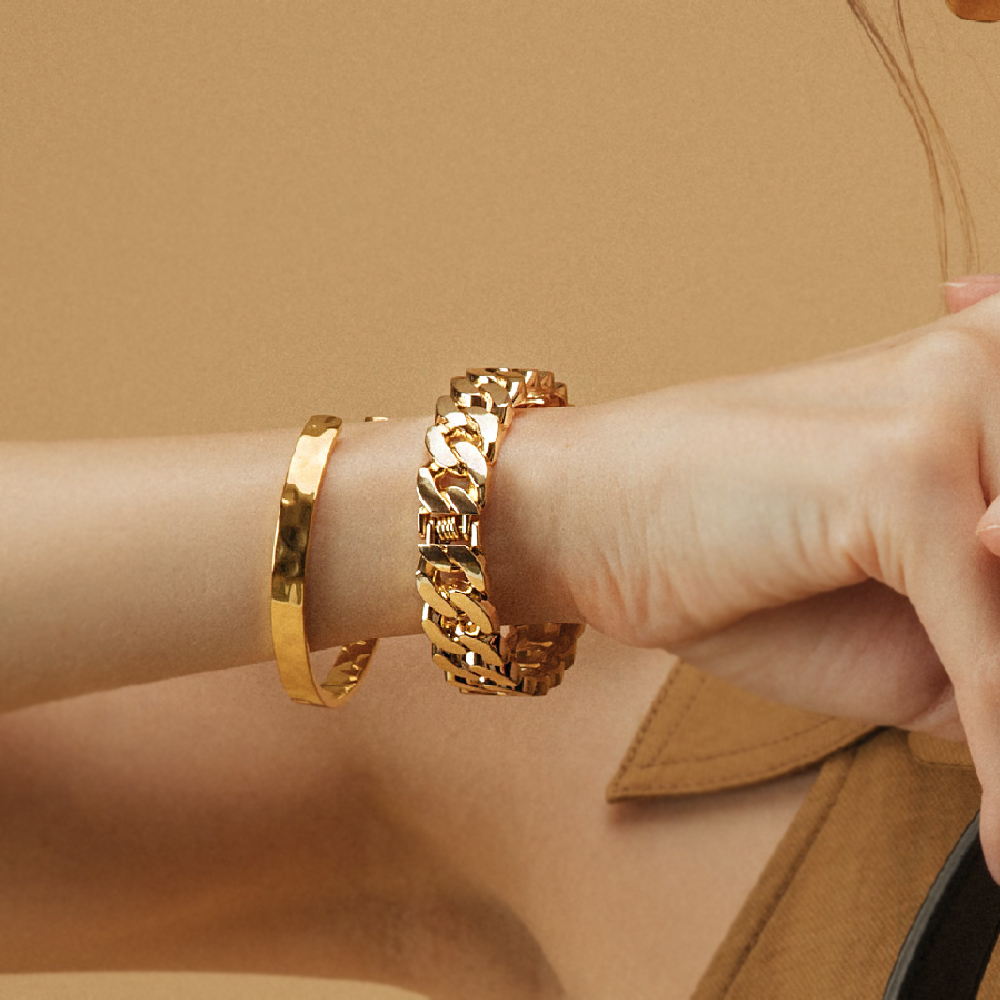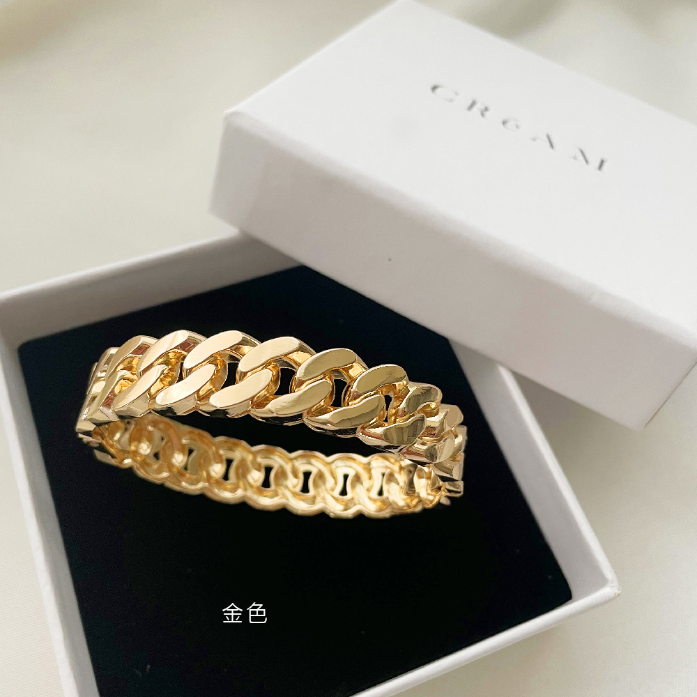 採用高品質鈦鋼合金鍍18K金色輕奢波紋捶紋手環