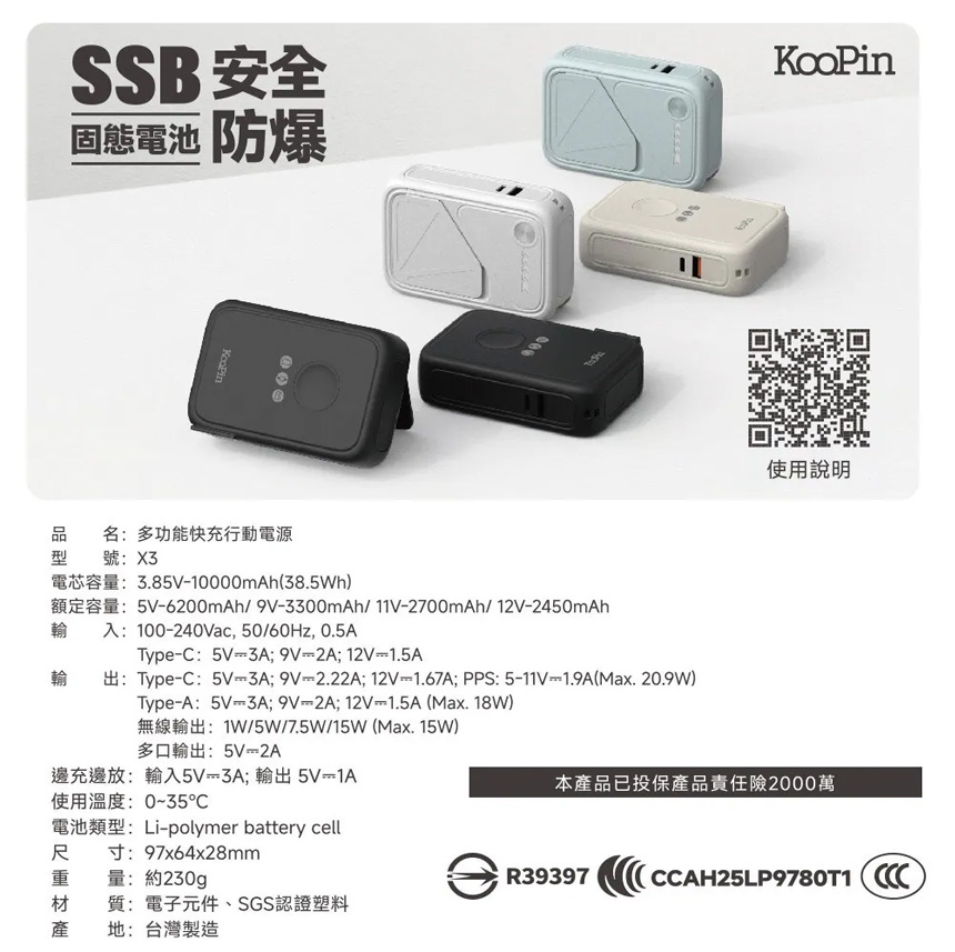 輸出:Type-C:5V-3A;9V-2.22A;12V=1.67A; PPS: 5-11V-1.9A(Max. 20.9W)