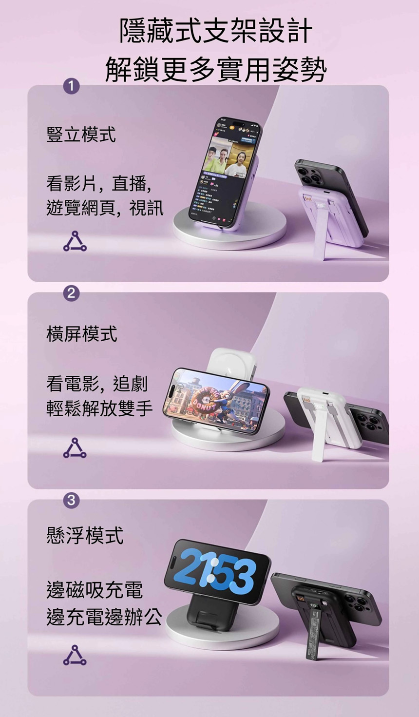 👉 隱藏式支架設計:直立、橫放、懸浮三種模式,邊充邊追劇、視訊不卡卡。