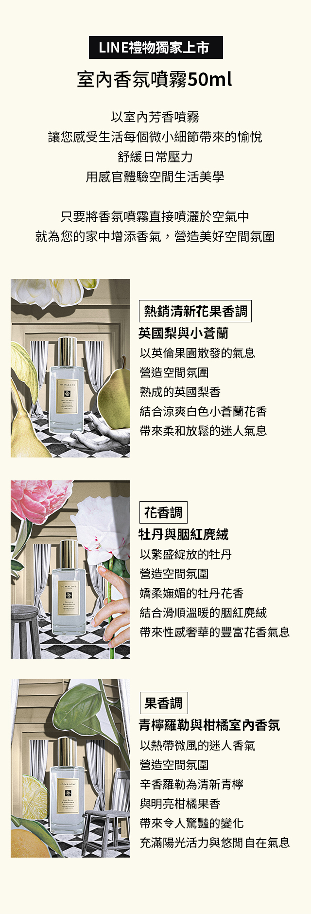 室內香氛噴霧50ML (英國梨與小蒼蘭/青檸羅勒與柑橘/黑莓子與月桂葉)