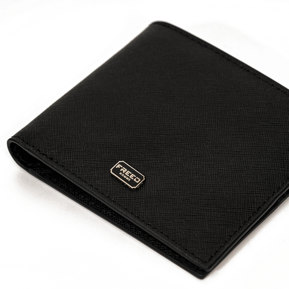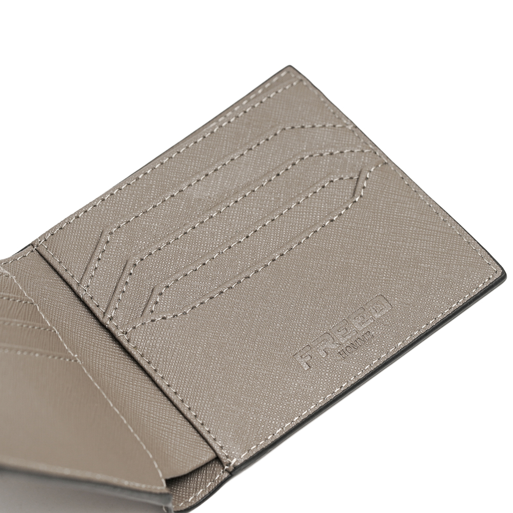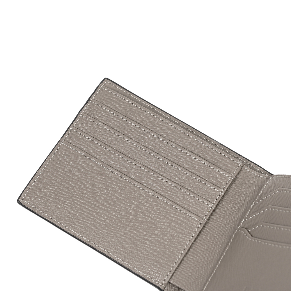 以俐落簡約為設計核心,這款短夾採用經典 Saffiano 十字壓紋真皮製作,展現低調沉穩的質感。兩折式的薄型結構,兼顧輕巧與實用收納,讓都會男士在商務與日常中都能隨心駕馭。