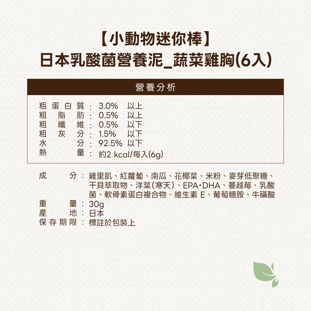 名稱: 【日本農產】小動物迷你棒-日本乳酸菌營養泥 - 蔬菜雞胸-5gx6入x5包組
