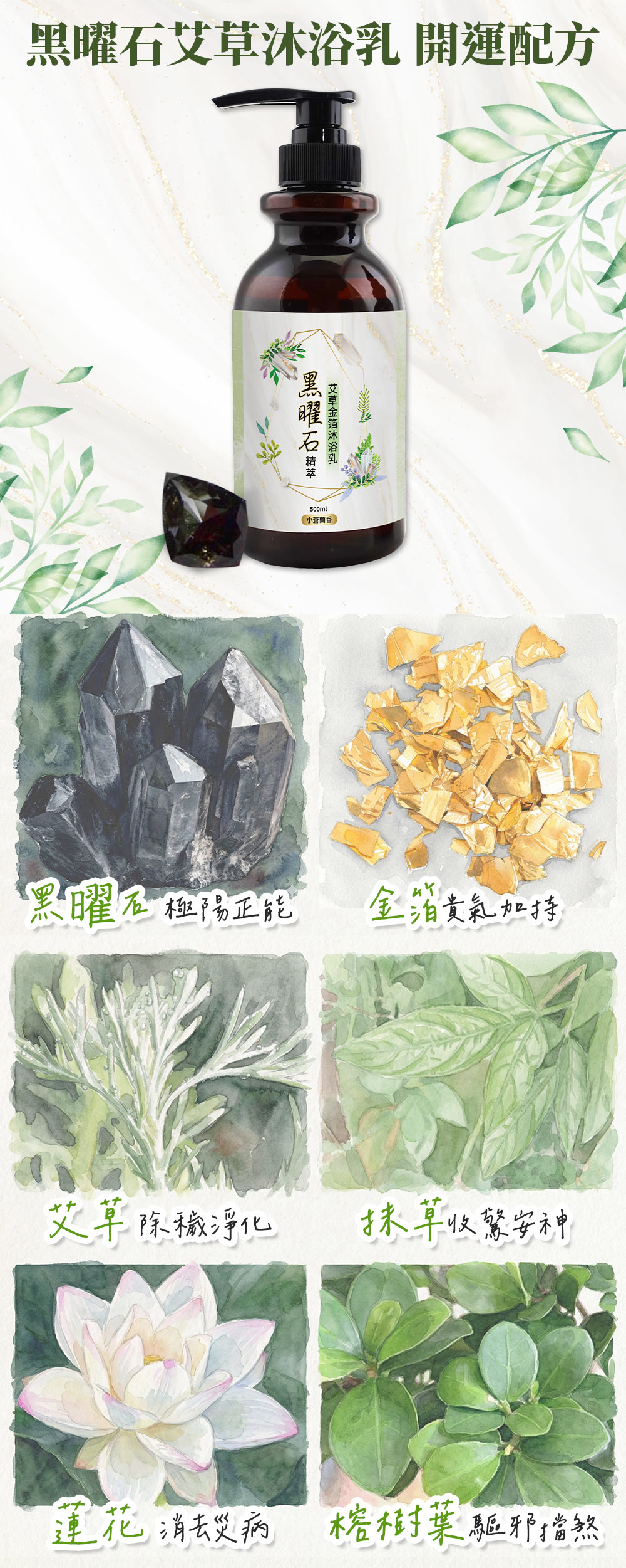 黑曜石精萃•艾草金箔沐浴乳x3瓶:午時水(D.I.Water)、Sodium Laureth Sulfate、Decyl Glucoside、Sodium Cocoamphoacetate、Disodium Laureth Sulfosuccinate、Cocamidopropyl Betaine、Fragrance(小蒼蘭、艾草、抹草、蓮花、榕樹葉)、Quaternium-80、chlorhexidine、Sodium sulfate、Citric acid、Propylene Glycol、Benzyl alcohol、PEG-9、黑曜石萃取液、金箔。