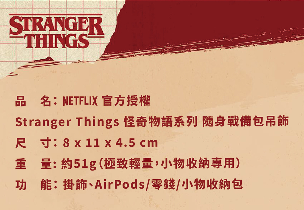 【產品規格】包裝內容物:官方授權|Stranger Things 怪奇物語系列 隨身戰備包吊飾 X 1材 質 :聚氯乙烯、聚酯纖維、鋅合金重 量 :約 51g商品尺寸 :約 8 x 11 x 4.5cm產 地 :中國大陸功 能 :掛飾、AirPods/零錢/小物收納包