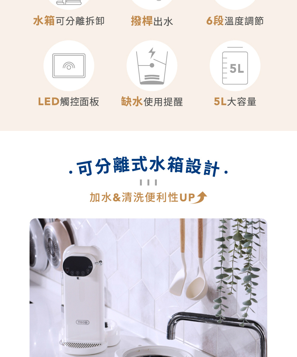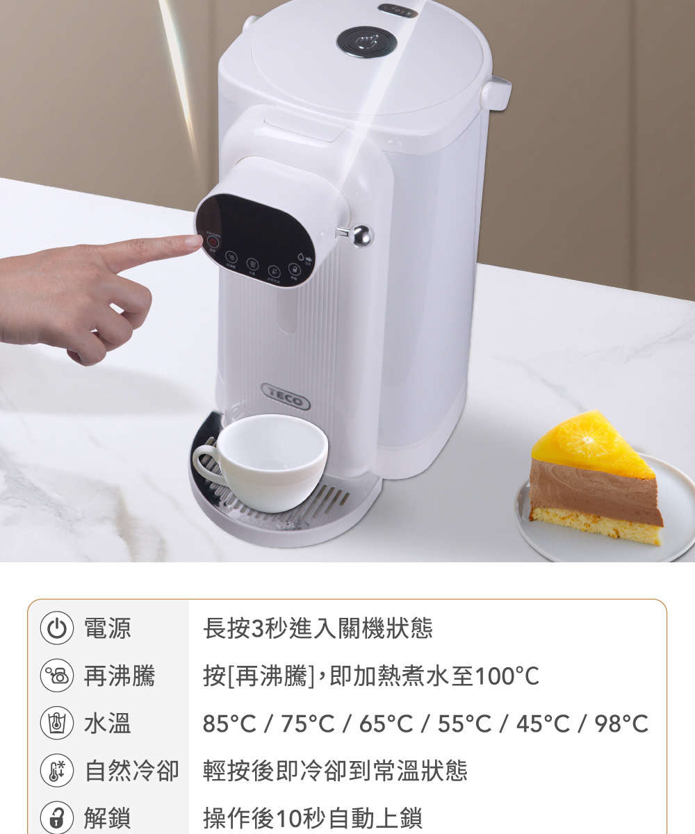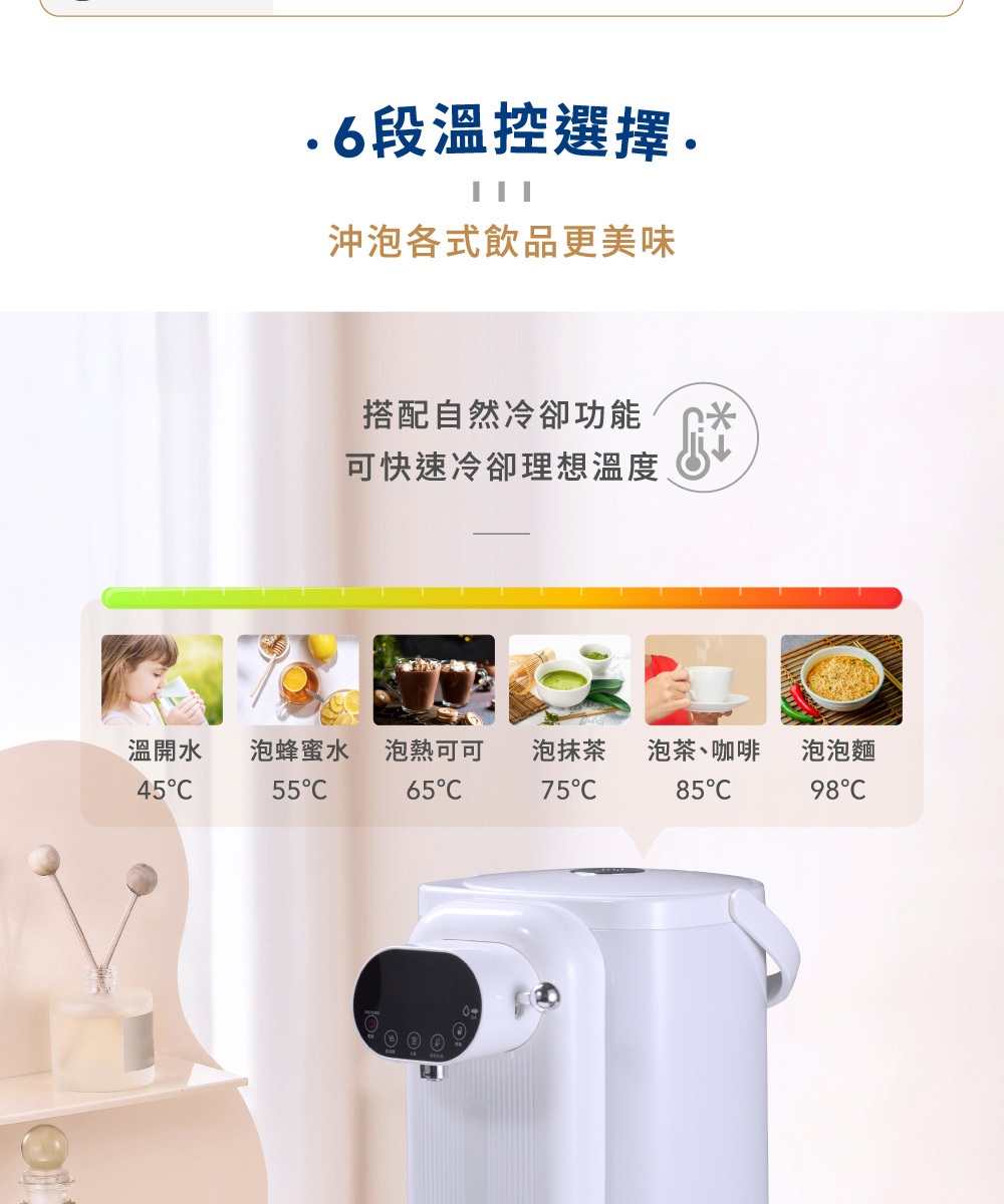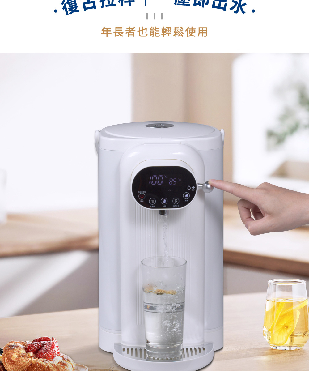 ◆5公升大容量,簡約白色時尚美型設計。◆食用級304不鏽鋼內膽,耐高溫、耐腐蝕、無異味。◆可分離式水箱設計,水電分離,避免電源接口進水。◆復古出水撥桿,一壓即出水,年長者也能輕鬆使用。◆LED觸控顯示面板,水溫設定隨時清晰可見。◆6段溫控選擇(45℃/55℃/65℃/75℃/85℃/98℃)搭配自然冷卻功能,輕鬆選擇適合水溫。◆缺水提示功能,當水量小於設定量時,缺水顯示燈閃爍提示。◆磁吸式接水盤,出水不易溢出,清潔方便。◆吸盤式底座,穩固機身不位移。◆安全保護裝置,智能乾燒保護功能。