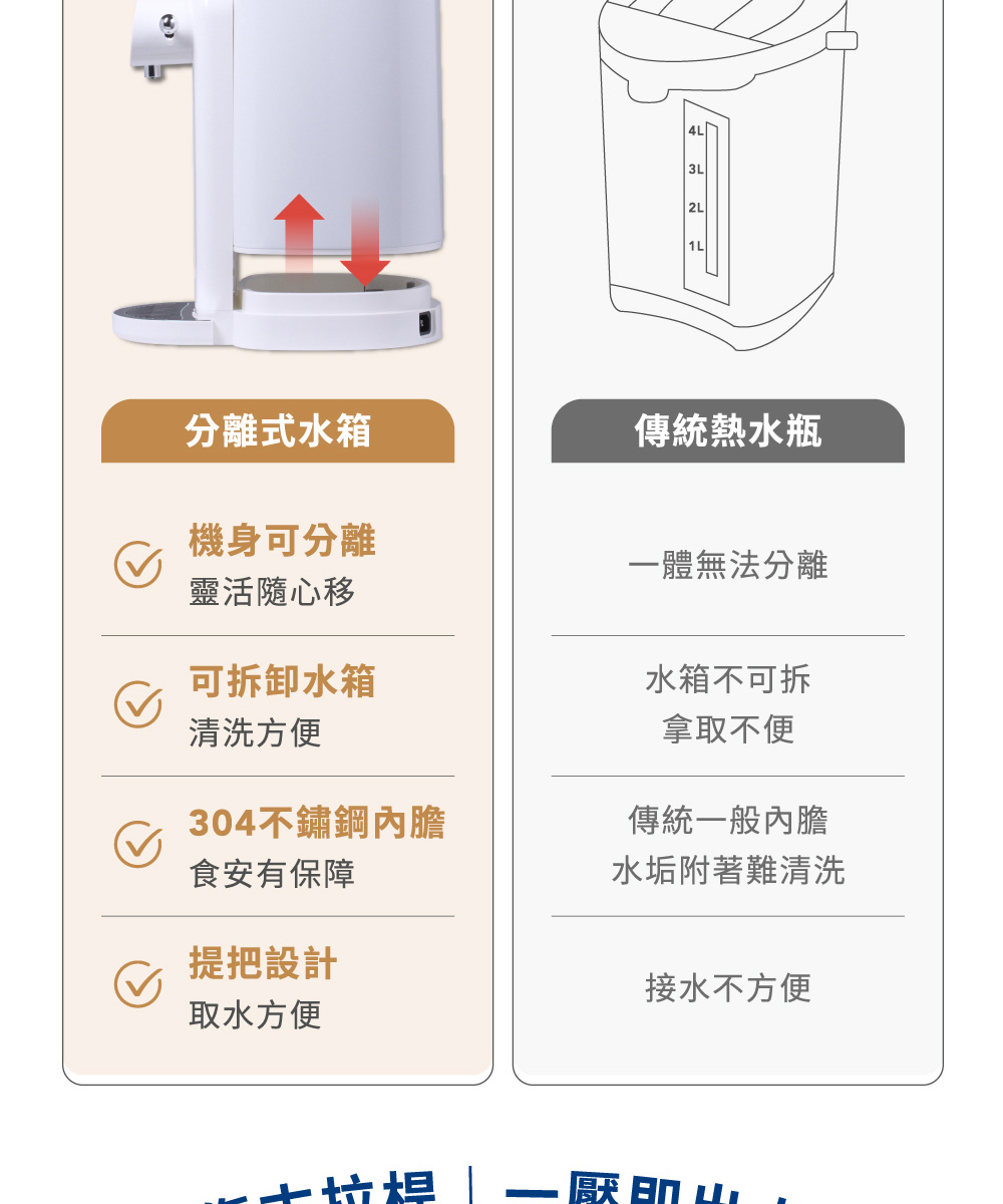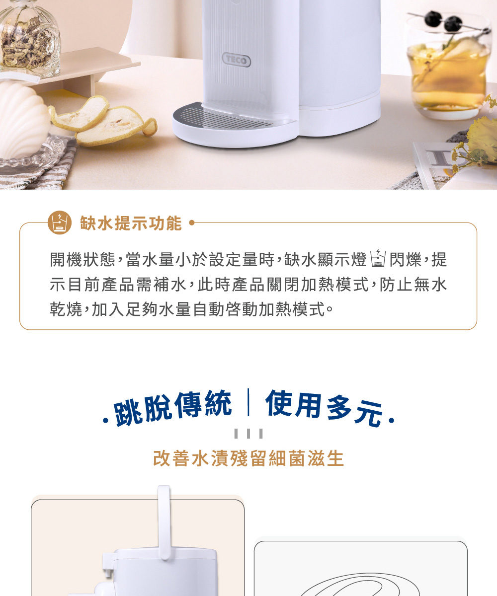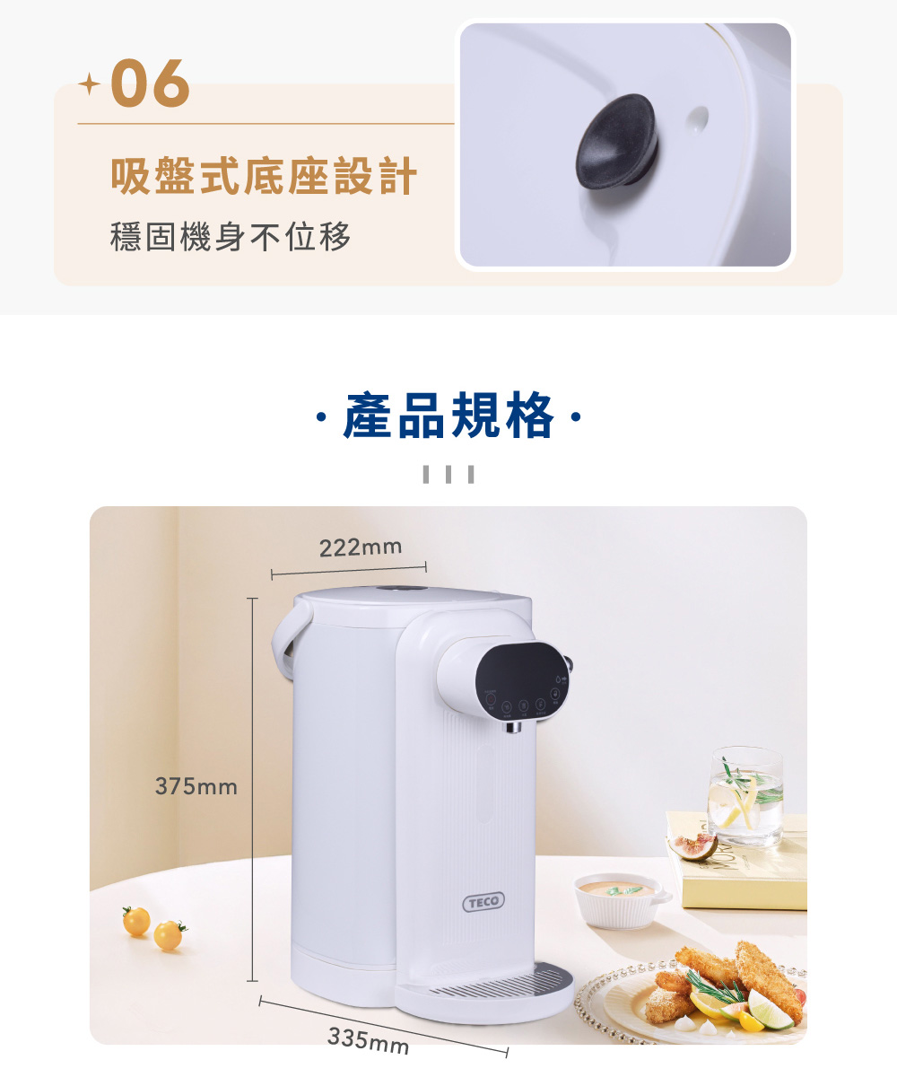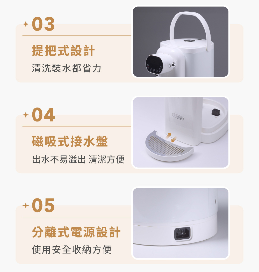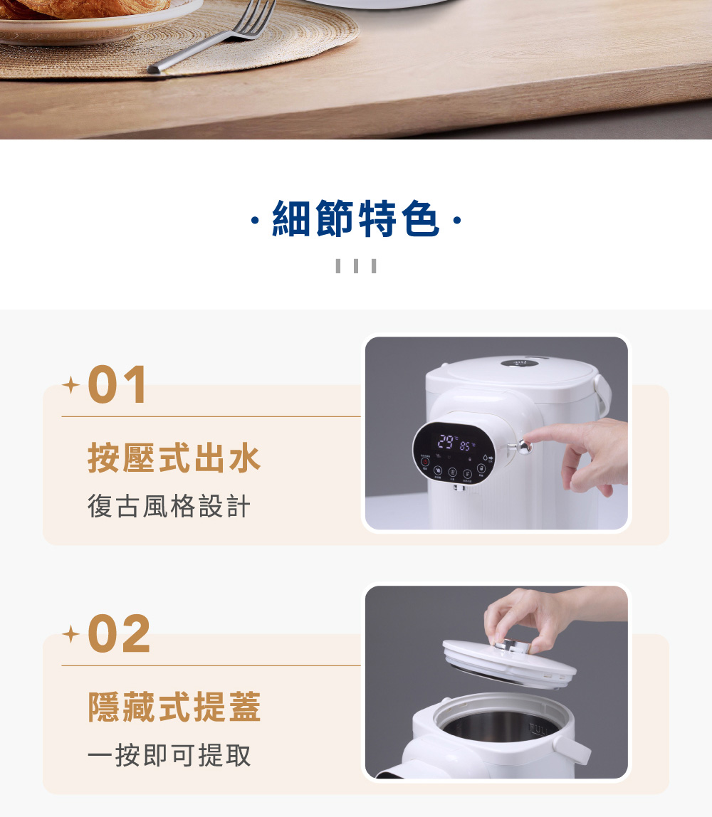 ◆5公升大容量,簡約白色時尚美型設計。◆食用級304不鏽鋼內膽,耐高溫、耐腐蝕、無異味。◆可分離式水箱設計,水電分離,避免電源接口進水。◆復古出水撥桿,一壓即出水,年長者也能輕鬆使用。◆LED觸控顯示面板,水溫設定隨時清晰可見。◆6段溫控選擇(45℃/55℃/65℃/75℃/85℃/98℃)搭配自然冷卻功能,輕鬆選擇適合水溫。◆缺水提示功能,當水量小於設定量時,缺水顯示燈閃爍提示。◆磁吸式接水盤,出水不易溢出,清潔方便。◆吸盤式底座,穩固機身不位移。◆安全保護裝置,智能乾燒保護功能。