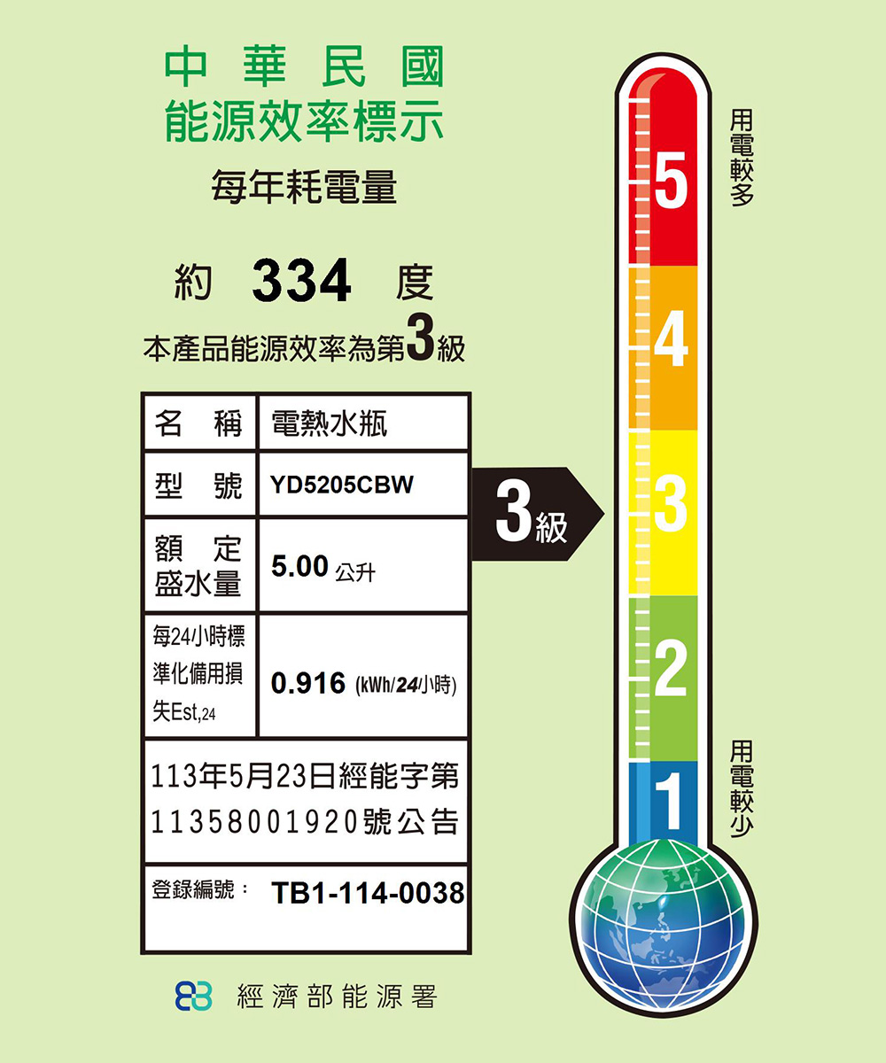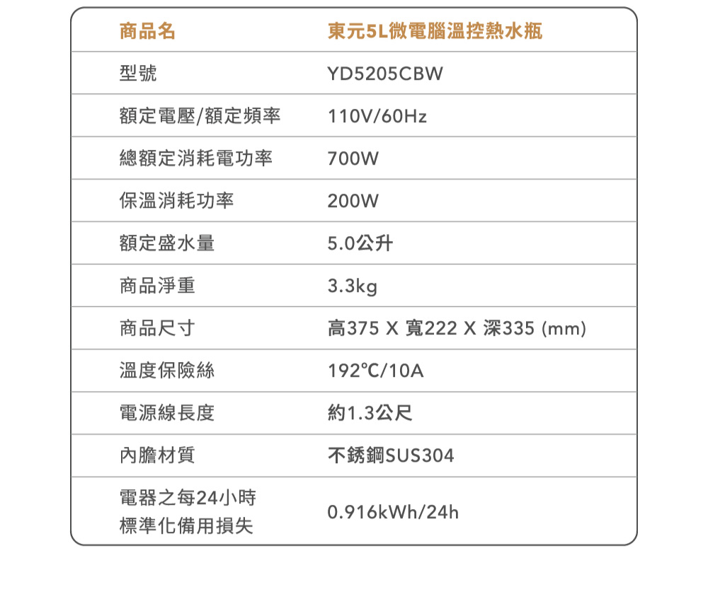 ◆型號:YD5205CBW◆額定電壓/額定頻率:110V/60Hz ◆容量:5.0公升 ◆消耗功率:700W ◆保溫消耗功率:200W ◆機體尺寸:(寬x高x深)222x375x335 mm ◆機體重量:3.3公斤 ◆溫度保險絲:192°C/10A◆內膽材質:不鏽鋼SUS304◆電器之每24小時標準化備用損失:0.916kWh/24h◆電源線長度:約1.3公尺◆國際條碼:4718074434596 ◆商登字號:R3B503 (到期日:116/06/24)◆產地:中國◆保固:正常使用下全機一年保固