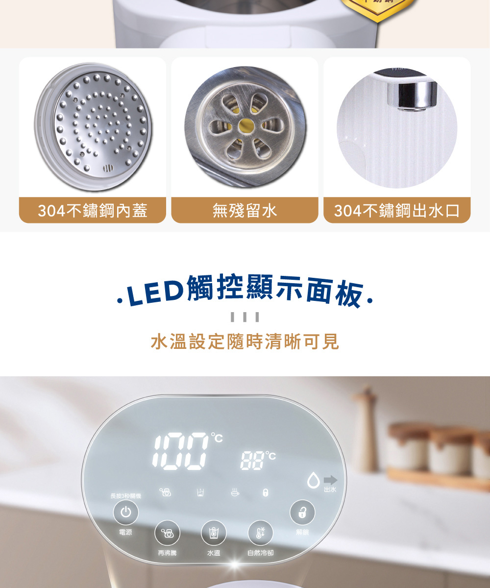 ◆食用級304不鏽鋼材質◆出水撥桿,一壓即出水◆LED觸控顯示面板◆水箱可分離拆卸,加水清洗方便◆6段溫控,輕鬆選擇水溫◆智能防乾燒保護功能