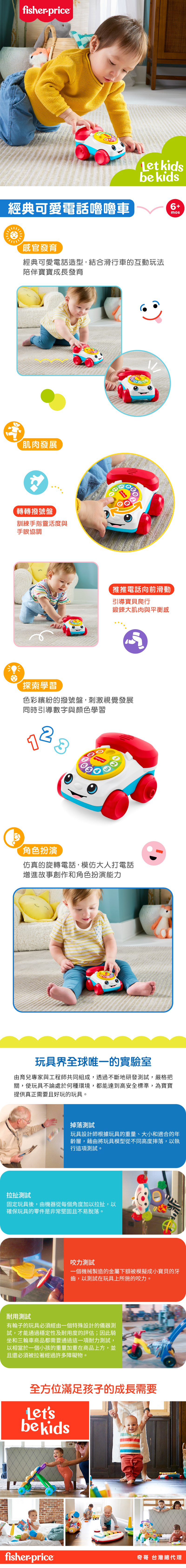 1. ""費雪經典可愛電話嚕嚕車""靈感來自費雪經典可愛電話,結合滑行車造型與趣味互動設計,陪伴寶寶在追逐與探索中培養動作發展。2. 旋轉撥號盤可愛的轉盤設計,讓寶寶手指動一動,訓練精細動作與手眼協調。3. 趣味聲音效果,每次推動或撥動時都能發出吸引人的聲響,激發聽覺與探索慾望。4. 輕推就會往前滑行,鼓勵寶寶爬行、追逐,增進大肌肉發展和平衡能力。5. 讓寶寶一邊追、一邊笑,邊玩邊學,在滾動與聲音的樂趣中提升動作大動作技能。
